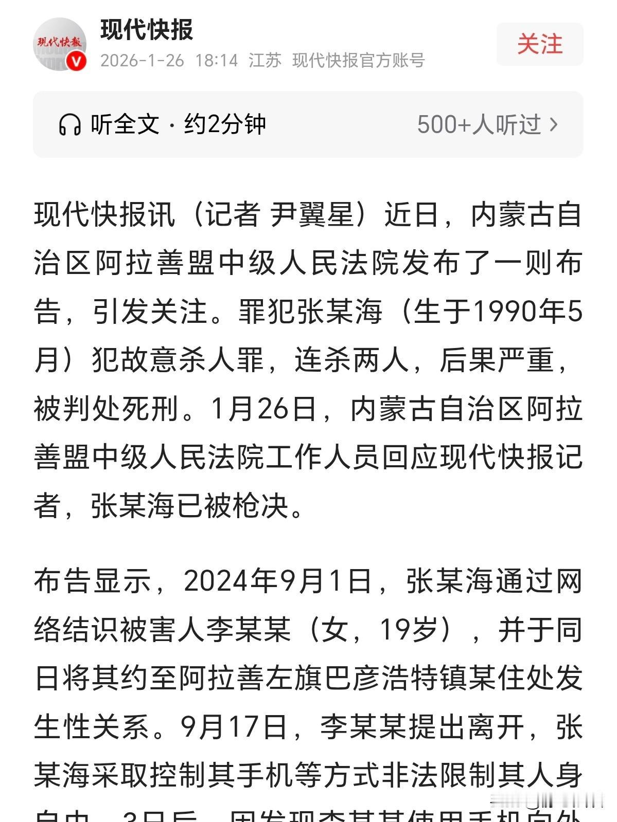 内蒙古阿拉善,34岁男子把19岁女孩约到住处,俩人发生关系后,俩人厮混了几日,女孩觉察到不对劲,想走却被男子强行拦下,还被限制了人身自由。女孩偷偷向外求助,被男子发现后害死。更可恶的是,他事后冒充女孩,把她19岁的闺蜜也骗了出来,发生关系后,又将闺蜜带到偏僻处给害了。 2026年1月23日,内蒙古阿拉善左旗,34岁的张某海,被判处枪决。 谁能想到,这起骇人听闻的案件,竟是从一次网络结识开始的。 2024年9月1日,张某海在网上认识了19岁的女孩李某某。 李某某涉世未深,被张某海花言巧语,哄得团团转。 刚聊了没几天,张某海就把女孩约到了自己的住处,两人发生了关系。 之后的几天里,李某某一直和他厮混在一起,可相处越久,女孩越觉得张某海不对劲。 他性格古怪,控制欲极强,眼神深处总透着一股让人不安的感觉。 9月17日,李某某实在忍不下去,提出要离开。 可张某海当场就变了脸,直接把女孩的手机抢了过去,还把门窗锁死,硬生生限制了她的人身自由。 被关起来的日子里,李某某整天提心吊胆,她知道再这样下去迟早会出事。 三天后,趁着张某海不注意,她偷偷拿回手机想向外求救,可刚发出消息,就被张某海发现了。 丧心病狂的张某海怕事情败露,二话不说就对这个年仅19岁的女孩下了毒手。 害了李某某后,张某海不仅没有丝毫悔意,反而愈发肆无忌惮。 他翻遍了女孩的手机,找到了她19岁闺蜜朱某的联系方式。 同2024年10月,他冒充李某某的身份联系上朱某,还以给好处费为诱饵,哄骗朱某来自己家。 天真的朱某以为是好朋友找自己帮忙,毫无防备地赶了过去,结果被张某海强迫发生了关系。 可张某海并没有打算放过她。10月8日,张某海开车把朱某带到一处荒无人烟的偏僻地方,在确认四周没人后,又把朱某加害了。 两条花一样的生命,本该在阳光下绽放,却因为张某海的自私与残暴,永远停在了19岁。 他们的家人痛不欲生,无数人为这两个女孩感到惋惜。 好在正义从不缺席,张某海因犯故意杀人罪,连害两人,最依法判处死刑。 两个19岁的女孩,花一般的年纪,本该有光明的未来,却因为交友不慎丢了性命,实在太可惜。 她们的家人含辛茹苦把孩子养大,好好的大姑娘说没就没了,那种痛真的没法想象。 张某海简直没人性,害了女孩又对闺蜜下手。好在法律公正,枪决的判决也算是给逝者和家属一个慰藉。 这事儿也给女孩们提个醒,一定要自珍自爱,网上交友可不能太单纯。 别轻易被陌生人的花言巧语哄住,更不能随便跟不熟的人去住处。 凡事多留个心眼,保护好自己才是最重要的,避免悲剧的发生。 对于李某的遭遇,你怎么看呢?欢迎评论留言! @静心法谈 学法辨是非,慬法不吃亏。