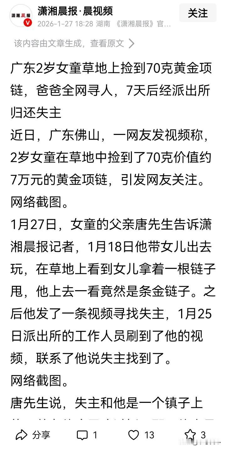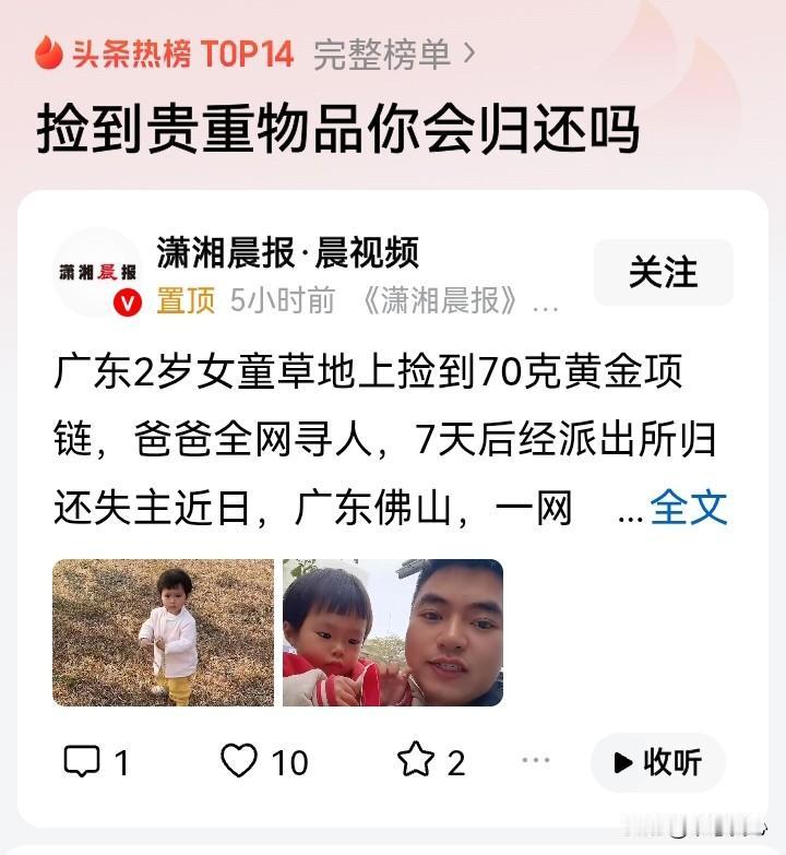 金价过千,70克的金饰,值100000元左右了。捡到,如此“天降横财”,你会归还吗? 小孩子都懂的道理,大人反而假装不明白了! 别人的东西,不要拿,捡到要归还或交给警察叔叔。 这是小孩子在幼儿园学到的基本道德吧。 只是,到了成年人,反而要讨论? 贵重物品,更加要归还啊;假如捡到物品者,比较困难,要求给个10%以内的报酬,毕竟对他来说,也可以说是“天降横财”了,还能给回,值得鼓励! 物主应该也斟酌着给,不要变成知道此事的人想着“早知道不给回好了”……捡到贵重物品你会归还吗
