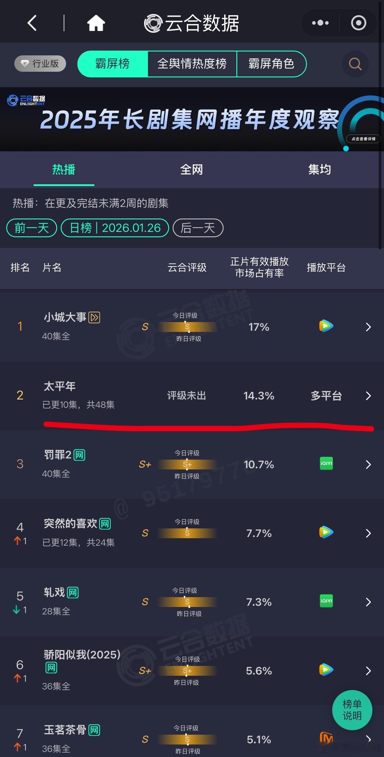 白宇、周雨彤、朱亚文主演,诸多老戏骨加盟的《太平年》血扑街的厉害,再次说明没有扛剧演员、没有号召力演员确实会是大的问题,观众压根都不想点进来看这个剧,即便你这个剧质量再高也只能就没有后续了。这部大剧又是巨资投入,三平台播成这个样,可以说毫无声量,血扑。白宇,周雨彤这些年接了多少好资源,观众缘真的感觉是一点没有培养起来,这剧播成这样真的很影响长剧市场的信心~ 太平年编剧