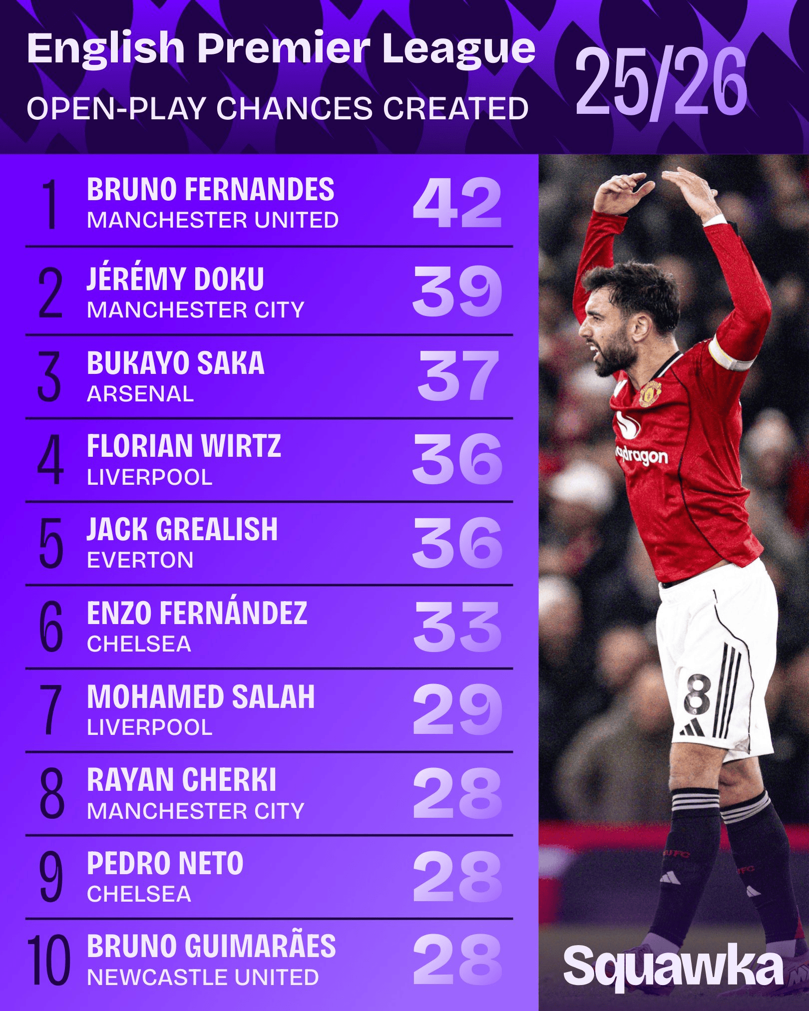 1.布鲁诺-费尔南德斯(曼联)42次