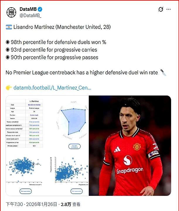 175cm也能英超锁死? 他十字韧带断了301天,回来第一场就把曼城锋线踢回半场。对抗成功率干到98%,带球推进93%,往前传球90%,三项全是后卫榜第一。 阿莫林直接把他钉在左中卫,球从门将出来先找他,一脚长传找拉师傅,反击三秒成形。之前曼联怕快反,现在利马提前半步卡线路,对面直塞刚起脚就被他铲飞。 小个子不靠弹跳,靠算步点。对手背身拿球,他贴上去先顶膝盖,再下脚,裁判哨子都慢半拍。 我盯了五场,他每场至少两次把自己横着扔出去堵线路。球迷说他玩命,其实那是聪明,提前算到球路,用身体当路障。 曼联冬夏没买中卫,就是赌他能健康。赌对了,后场出球提速两档,积分也跟着爬坡。 身高是天生的,胆子不是。利马把短板活成标签,小个子一样能当城墙。