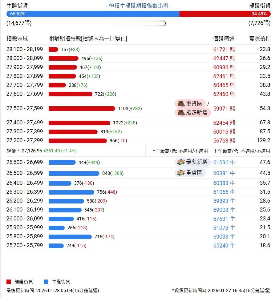 中信证券牛熊证街货分布图中的数据显示,熊证街货重货区和最多新增都在27500-27599区间,该区间最新熊证数量为1103张,较上一交易日增加282张。