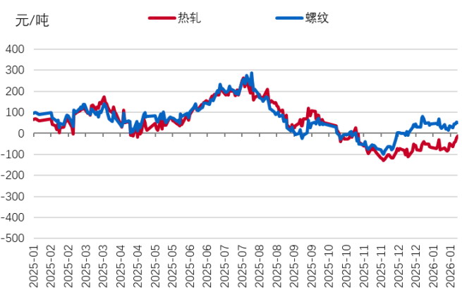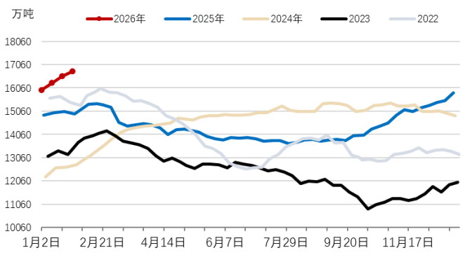 2026年截至1月22日,螺纹钢表观需求累计同比增加62.3万吨,热轧卷板表观需求累计同比增加23.2万吨。终端需求看似偏强,但考虑到2026年春节放假偏晚,若从农历视角来看,春节前第四周螺纹钢表观需求较2025年同期下降5.95%,且此前几周需求同比降幅均在10%以上。热轧卷板表观需求相对乐观,过去几周同比涨跌互现。另外,在农历视角下,螺纹钢及热轧卷板库存同比偏高。当前,螺纹钢库存同比增加10.68%,热轧卷板库存同比增加16.54%。随着春节临近,库存还将进一步累积。