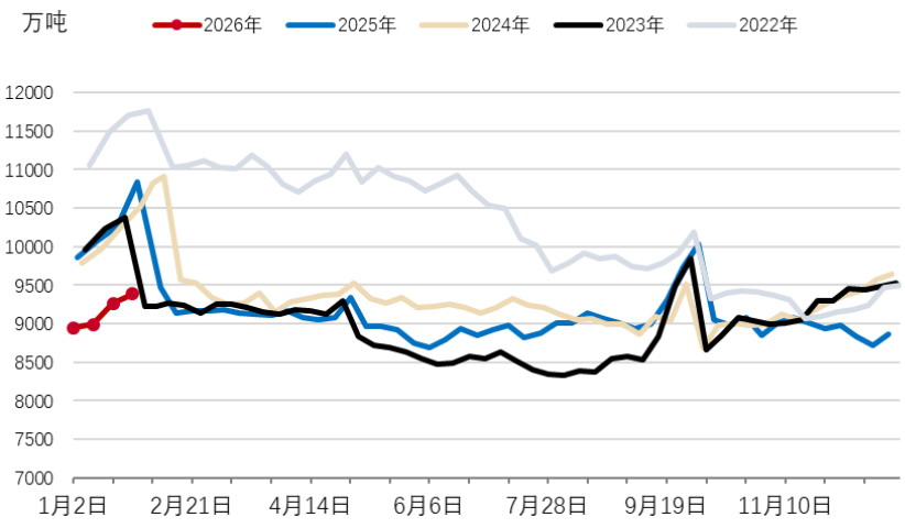利润方面,当前长流程螺纹钢粗算利润为52元/吨,近期维持微幅盈利。长流程热轧粗算利润为-13元/吨,开年以来整体有所好转,但仍未能恢复盈利。截至1月23日,247家钢厂高炉日均铁水产量为228.1万吨,较2025年同期高2.65万吨。2026年以来,铁水产量一直在近5年同期高位震荡。由于钢厂利润表现不佳以及春节前后终端需求承压,铁水产量回升的难度较大。