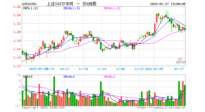1月27日,上证50ETF东财(530050)跌0.50%,成交额809.37万元。当日份额增加300.00万份,最新份额为1.46亿份,近20个交易日份额增加0.00份。最新资产净值计算值为1.75亿元。