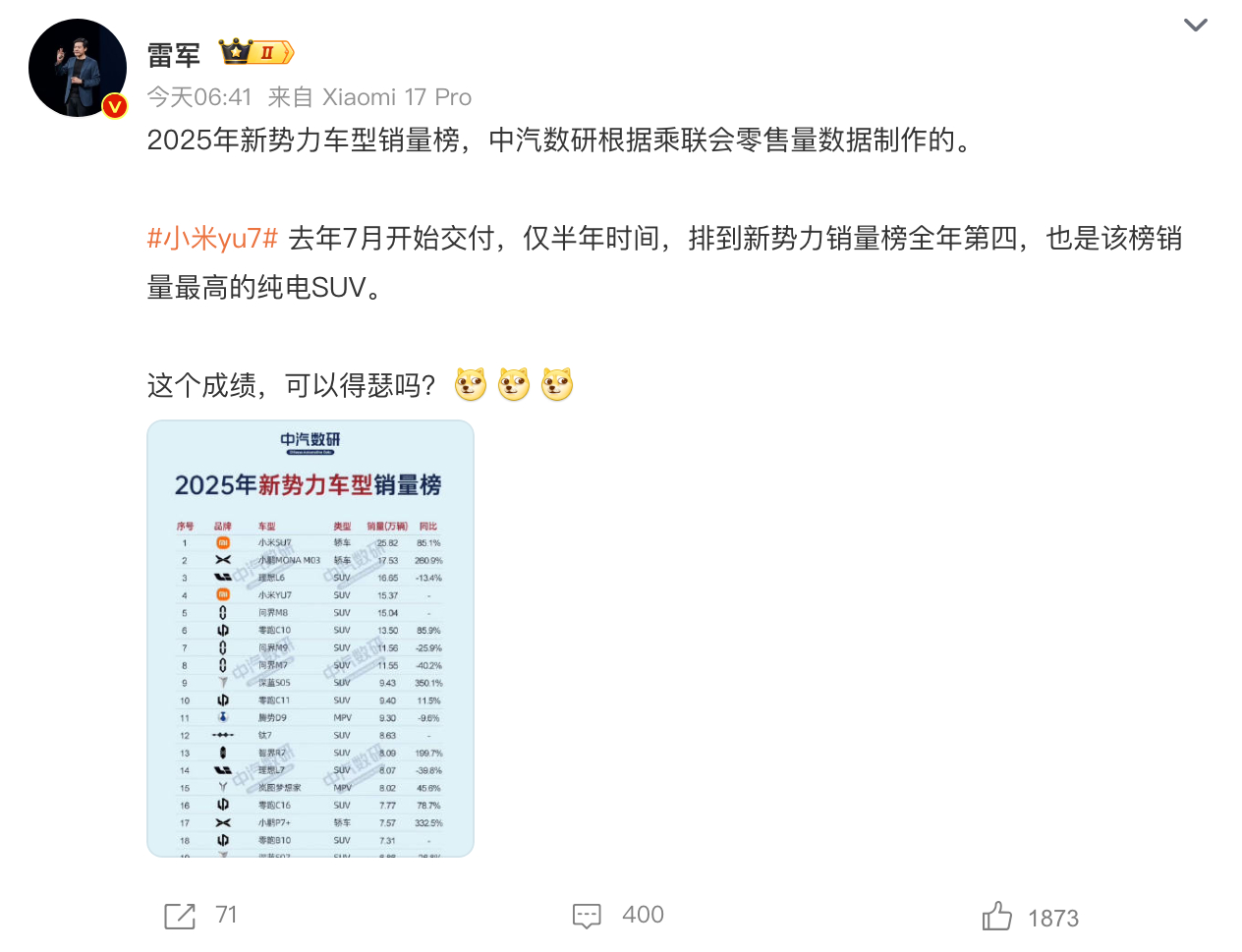 雷军:小米YU7仅半年就排到全年第四,可以得瑟吗