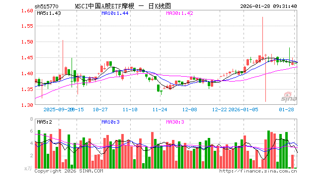 1月28日,MSCI中国A股ETF摩根(515770)开盘跌0.14%,报1.430元。MSCI中国A股ETF摩根(515770)重仓股方面,贵州茅台开盘涨0.00%,宁德时代跌0.45%,招商银行涨0.05%,工业富联涨2.18%,中国平安涨0.86%,紫金矿业涨1.95%,中际旭创涨2.66%,长江电力涨0.00%,农业银行跌0.58%,寒武纪涨0.69%。
