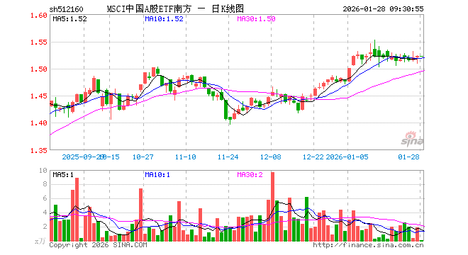 1月28日,MSCI中国A股ETF南方(512160)开盘涨0.07%,报1.523元。MSCI中国A股ETF南方(512160)重仓股方面,贵州茅台开盘涨0.00%,宁德时代跌0.45%,招商银行涨0.05%,工业富联涨2.18%,中国平安涨0.86%,紫金矿业涨1.95%,中际旭创涨2.66%,长江电力涨0.00%,农业银行跌0.58%,寒武纪涨0.69%。