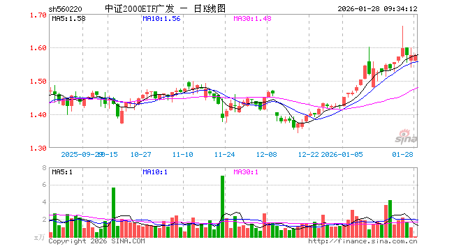 1月28日,中证2000ETF广发(560220)开盘跌0.95%,报1.560元。中证2000ETF广发(560220)重仓股方面,亚太股份开盘涨0.06%,南方泵业跌0.42%,新乡化纤涨0.14%,天阳科技跌0.20%,先进数通跌0.38%,硕贝德涨0.07%,立高食品跌0.46%,中青旅涨0.21%,炬芯科技涨0.02%,新北洋涨0.25%。