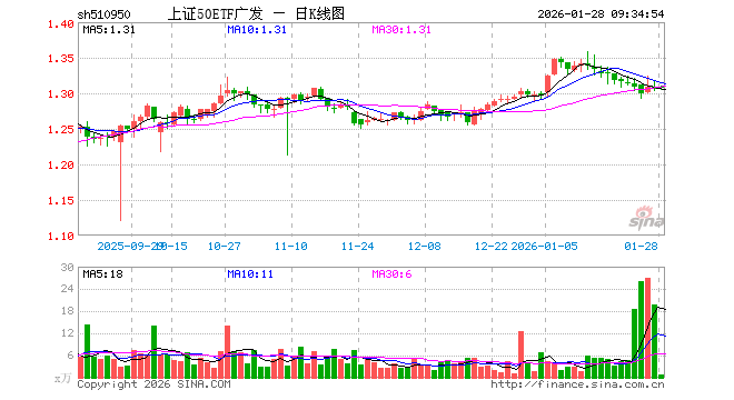 1月28日,上证50ETF广发(510950)开盘涨0.23%,报1.309元。上证50ETF广发(510950)重仓股方面,贵州茅台开盘涨0.00%,中国平安涨0.86%,紫金矿业涨1.95%,招商银行涨0.05%,兴业银行跌0.05%,长江电力涨0.00%,寒武纪涨0.69%,中信证券涨0.11%,恒瑞医药涨0.42%,工商银行跌0.28%。