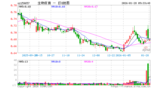 1月28日,疫苗ETF鹏华(159657)开盘跌1.03%,报0.675元。疫苗ETF鹏华(159657)重仓股方面,复星医药开盘涨0.04%,长春高新涨0.02%,智飞生物跌1.29%,沃森生物跌0.30%,万泰生物跌0.07%,华兰生物跌0.80%,昭衍新药跌0.36%,丽珠集团涨0.31%,辽宁成大跌0.16%,康泰生物跌0.78%。