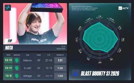虎扑01月28日讯HLTV公布BLAST赏金赛S3最佳阵容和EVP选手名单。其中冠军三人组Jame、nota、zweih入围一阵,亚军Falcons父子组合则占据狙击手和自由人位置。EVP仅颁发一人,在决赛表现出色年仅18岁的nota斩获个人职业生涯首个EVP称号!