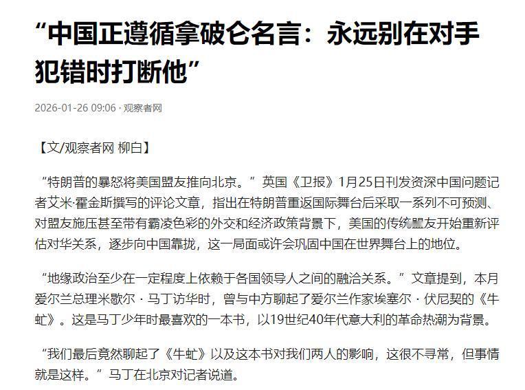 为何近期中国没有对特朗普过多指责?原来是中国铭记了拿破仑的一句名言! 先说特朗普这脾气,抓人总统、强占领土,甚至搞出个“和平委员会”想架空联合国,活脱脱把美国的底裤都扒了。但中国为啥不吭声?您看拿破仑带兵时咋说的——“永远别以为敌人比你愚蠢”。特朗普看似疯癫,实则在打“美国优先”的算盘:用极端手段逼各国站队,拿台湾问题当筹码,想把水搅浑了浑水摸鱼。 可中国太清楚了,跟疯子对骂只会掉价,不如让他自己演,演着演着破绽就露出来了。就说那个“和平委员会”,特朗普喊得震天响,结果安理会五常一个没去,最后签字的全是巴林、摩洛哥这些小国,活脱脱一场闹剧。中国从头到尾没吭声,就看着他自己把台子搭起来又塌下去——这招叫“欲让其灭亡,必先使其疯狂”,拿破仑流放时琢磨透的人性,咱们用得门清。 再说中国网民对特朗普的态度,挺有意思。好多人觉得他像个“接地气的商人”,真人秀里的霸道总裁范儿,反而比那些虚伪的政客真实。这其实暗合拿破仑的观察:“人类既渴望自由,又需要秩序”。 特朗普的乱来,恰恰反衬出中国“打,奉陪到底;谈,大门敞开”的定力。就像贸易战那会儿,特朗普喊着加200%关税,中国压根没慌——你加你的,我反制我的,最后美国农民上街抗议,咱们台湾同胞反而更亲近大陆了。这就是拿破仑说的“胜利属于最坚持不懈的人”,咱们不跟你斗气,就打持久战。 还有个关键,中国记着拿破仑的警告:“权力是把双刃剑”。特朗普现在的胡来,本质上是美国霸权衰落的焦虑。抓别国总统、抢格陵兰岛,看似强横,实则暴露了他“纸老虎”的本质。中国要是跟着指责,反而中了他的计——转移国内矛盾、制造外部敌人。 咱们偏不,就盯着联合国框架,反复强调“以国际法为基础”,把特朗普架在道德高台上烤。你看他搞的“和平委员会”,连加拿大都不买账,反而跟着中国喊“买国货”,这就是人心向背。拿破仑流放时写的《圣赫勒拿回忆录》里说,“在逆境中才能看清人性”,现在美国盟友的离心离德,不正是特朗普自己作出来的? 更绝的是,中国看透了特朗普的“商人本质”。他那些极端言论,说白了是谈判策略——先漫天要价,再就地还钱。但中国不吃这一套,你喊你的关税,我走我的节奏。台湾问题是核心利益,咱们该军演军演,该惠台惠台,压根不被关税威胁绑架。 这就像拿破仑打仗时的战术:“集中兵力攻击弱点”,咱们的弱点不在关税,而在台湾民心。特朗普越闹,台湾同胞越看清谁在真心维护他们的利益,去年台湾水果滞销,大陆二话不说包机采购,这比任何口号都管用。 最后,回到拿破仑那句“英雄不问来路”。中国现在的隐忍,不是怕事,而是谋大局。特朗普蹦跶得越欢,越证明美国霸权的黄昏到了。咱们不指责,是因为不屑于跟一个正在过气的角色浪费口水。 就像拿破仑说的“能控制情绪的人,比拿下城池的将军更伟大”,中国现在的定力,正是大国崛起的底气。等特朗普折腾够了,回头一看,中国早已在科技、贸易、外交上织好了网,台湾民心也越收越紧——这才是拿破仑没明说的真理:真正的胜利,从来不是打倒对手,而是让对手自己认输。