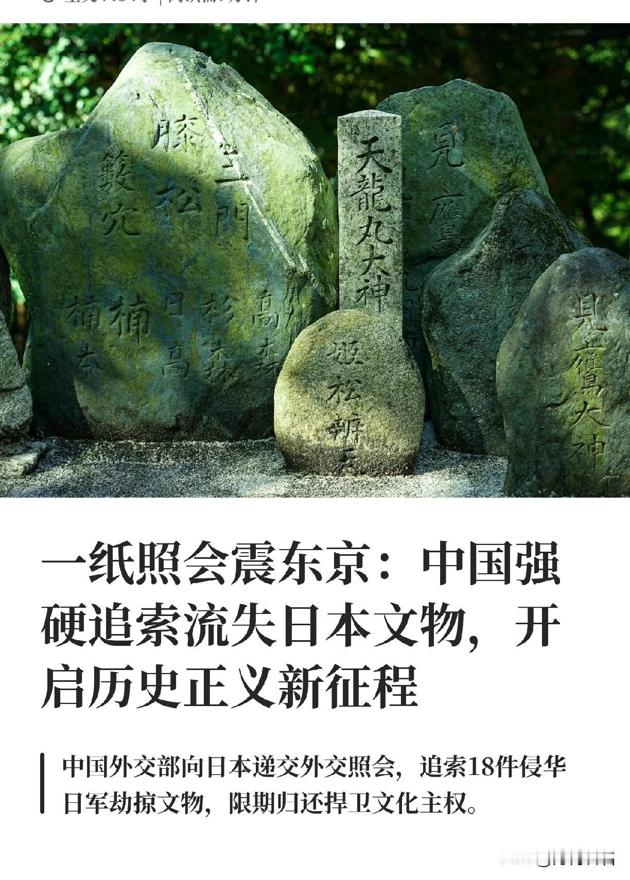 中国正式宣布 限日本在六个月之内,将首批战争中非法掠夺的国宝级文物归还,否则 就按国际法办他们。 日本人该还了! 一块被日本视为“中国国家主权石”的文物,日本刻意扭曲其来路,将碑石藏匿皇宫整整百年,试图用时间抹平掠夺的事实。 中方已明确认定,它是战争时期被非法掠夺的首批18件重要中国文物之一。然而,日本却打算将其包装成“国有财产”,公然拒绝归还——甚至在2005年,仅向中方提供过几张模糊不清的照片,敷衍了事。 此次中方要求日方6个月内移交,逾期将依国际法启动后续程序。历史账单,不可能无限期拖延。 日本从明治时代到战后,他们系统化掠夺并拒绝追责,唐鸿胪井碑被抢,记录的是旧中国的屈辱记忆。据估计,日本掠夺的中国文物达数百万件,包括黄金、白银和矿产资源。 讽刺的是,连日本国内的有识之士都曾直言:抢来的东西,就该还给人家。可现实却是,政府却始终背道而驰,利用法律漏洞一拖再拖,竭力维护所谓的“既有财产”。这种做法,与其在慰安妇、强征劳工赔偿等历史问题上的态度如出一辙——本质都是选择性失忆,选择性负责。 历史不公若不纠正,就不会自行消散,只会在时间中不断发酵,该清算的,不只是文物,更是态度。