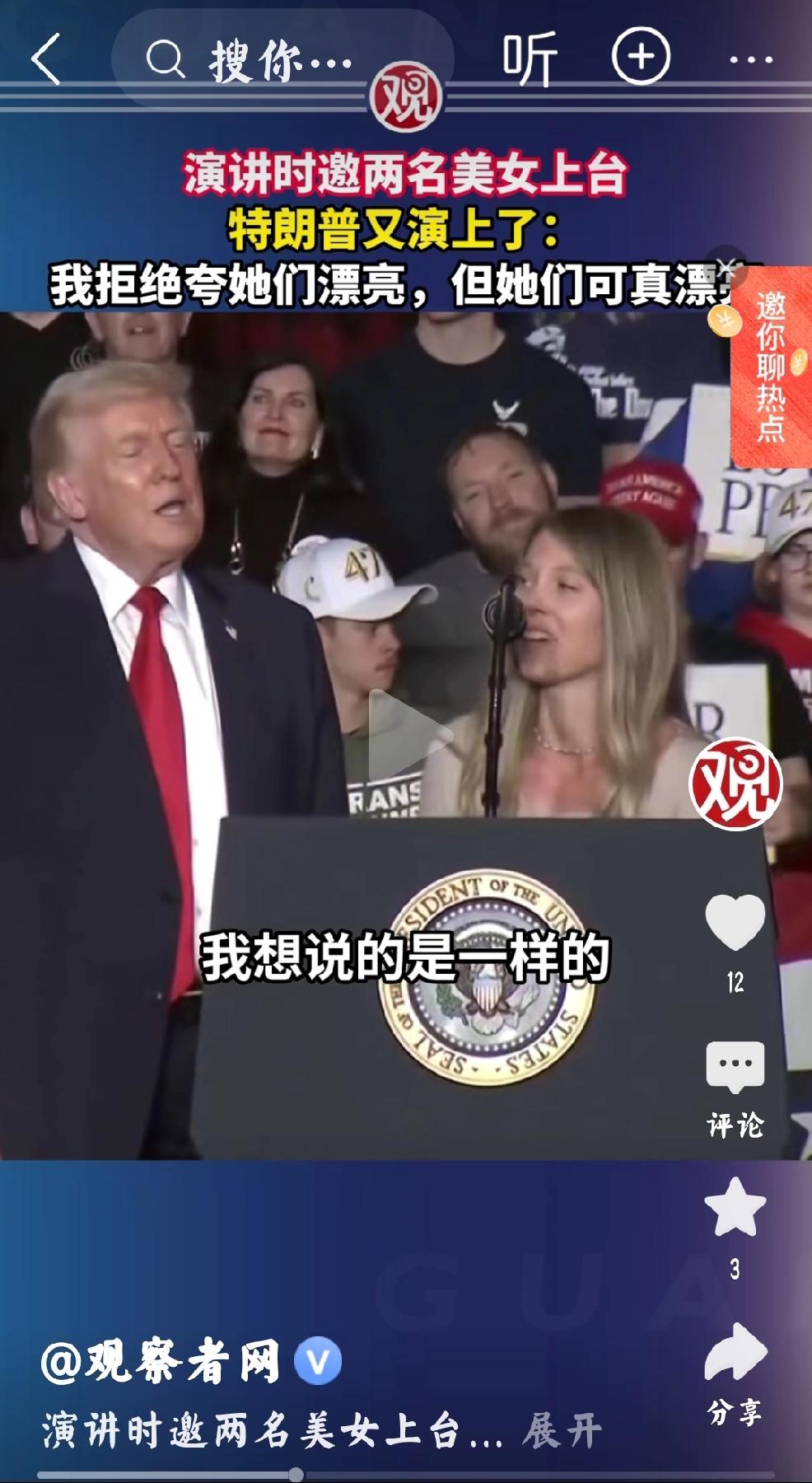 让人想起爱泼斯坦案 观察者网报道,1月27日,特朗普在美国爱荷华州举行演讲,邀请两位年轻貌美的白人女子上台,当面感谢特朗普。 个人认为:惺惺作态的当面做戏,不由得让人想起爱泼斯坦案当中的特朗普,两者强烈对比得出,特朗普一生如此,皆是演戏。
