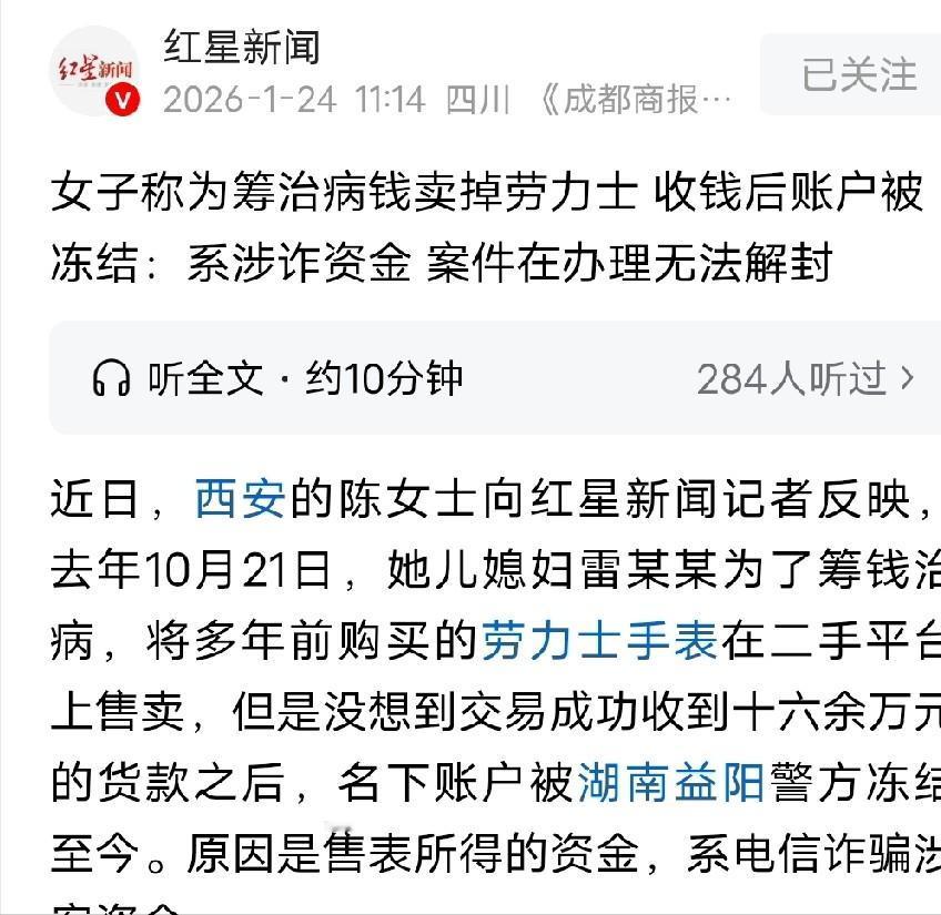 天塌了!陕西西安,女子得了癌症,为治病,把一块名牌手表卖了16.4万,收到钱第二天,银行账户被冻结,女子傻了眼,报警一查,说这16万是涉诈资金,女子拿出证据想解封,可没成功,警方协商女子和受害人双方均摊损失,女子不同意,警方回应:女子也有过错,因她还没排除洗钱的嫌疑,手表还在寻找中,解封可能还要等…… 164,000元。 在手机银行冰冷的夜间模式里,这串数字旁边赫然贴着一个刺眼的红色标签:“冻结”。 对于远在湖南益阳的办案民警来说,这只是电信诈骗庞大涉案资金池里的一滴水,是一串需要被锁定的非法数据流。 但对于西安的雷女士而言,这笔钱不是数字,是用来阻击肺部癌细胞的最后弹药。 此时此刻,距离那个改变命运的交易日已经过去了三个月,日历翻到了2026年1月。钱还在卡里,看得见摸不着。表已经没了,消失在茫茫黑市。 把时间拨回去年10月21日。 这原本是一场堪称“教科书级别”的奢侈品变现局,至少雷女士一家当时是这么认为的。 为了填补烧烤店倒闭留下的窟窿和应对日益逼近的化疗期,她拿出了家里唯一值钱的家当——一块多年前购入的劳力士。 买家是一家“二手钟表公司”,听起来正规得无懈可击。 对方派来的验表师更是演技在线,拿着放大镜查吊牌、验保修卡,每一个动作都在传递着“专业”的信号。这其实是骗子精心铺设的第一层心理麻醉剂:让他们相信这是生意,而不是掠夺。 致命的陷阱触发在当天下午5点。 请记住这个时间节点,这是整个洗钱闭环中最关键的“逻辑扳机”。交易达成,价格谈妥,对方突然抛出一个理由:银行下班了,对公账户转账受限。 紧接着,那个足以毁掉一切的提议出现了——“不如直接私下转账吧,快一点。” 对于一个急等着钱去医院缴费的人来说,“快”就是最大的诱惑。 雷女士核验了对方的营业执照,以为自己做了尽职调查,便同意脱离平台监管。 就在这一瞬间,性质变了。 在法律的视角里,雷女士从一个出售私产的合法公民,瞬间滑落到了“未尽审核义务”的灰色地带。 随着16.4万元到账,验表师抓起手表转身就走,消失在西安的夜色里。 第二天,当雷女士站在医院缴费窗口前,发现银行卡被冻结时,那张精心编织的大网才终于显露真容。湖南益阳警方跨省按下了暂停键,因为打进雷女士卡里的这笔钱,源头是电信诈骗受害者的血汗。 这简直是一个死局。 在警方的侦查逻辑里,资金源头不干净,卖家又绕开了正规平台搞私下交易,这就无法排除“协助洗钱”的嫌疑。 办案人员的话说得很直白:你在民事上是有过错的。 而在雷女士看来,这简直是荒谬的。 她提供了验表视频、聊天记录、交易合同,证明自己是善意取得。“我卖我自己的表,难道还要我有能力去核查买家每一分钱的来路吗?” 更残酷的博弈发生在谈判桌上。警方抓到了两名负责转移手表的嫌疑人,但那块劳力士早在去年就像接力棒一样,从验表师手里传给接头人,再转手飞向了不知名的下家,追回概率渺茫。 为了解套,警方提出了一个听起来很“公平”的方案:让雷女士和电诈受害人分摊损失,退还部分款项以换取解封。这在司法实践中并不罕见,试图让两个受害者互相买单来平账。 雷女士拒绝了。她的理由硬得像那块消失的钢表:货我已经交了,交易已经完成了,凭什么让我既丢了表,又要退钱?这不仅仅是钱的问题,是生存资源的归属权问题。 这并非孤例。 南京此前也有一位患癌宝妈遭遇了同样的“杀猪盘”,卖表所得的32万被冻结,连带着医保卡都停摆了。 这已经形成了一条针对急需变现人群的黑色产业链:骗子用脏钱买走你的硬通货(手表、黄金),然后迅速倒手洗白。 留下一地鸡毛的,是两个被困在系统里的受害者。 一边是丢了积蓄的电诈受害人,一边是丢了资产又等着救命钱的癌症患者。 截至今年1月,益阳警方给出的回应依旧是“案件仍在侦办,暂无法解封”。法律有法律的程序正义,冻结有期限,侦查有流程。 但癌症没有耐心,它不会因为案件没破就停止扩散。 在那块劳力士手表的指针停止转动之前,雷女士生命倒计时的钟摆,还在无情地摇摆。 在这场关于生死的拉锯战里,似乎没有赢家,只有冰冷的法理与滚烫的生存欲望,在西安寒冷的冬风中剧烈碰撞。 信息来源:《1月23日,湖南益阳资阳区警方回应女子为治病卖劳力士账户被冻结:售表所得货款系涉诈资金,案件仍在侦办暂无法解封。》四川观察