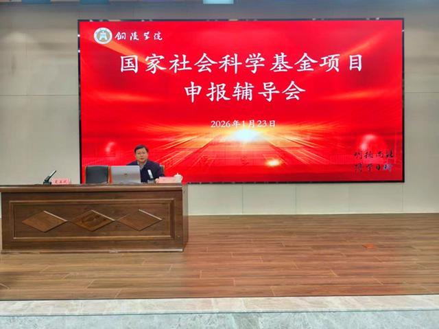 近日,铜陵学院召开2026年度国家社科基金项目申报辅导会。会议邀请中共安徽省委宣传部理论处一级调研员唐国富,安徽大学人文社会科学处处长、博士生导师李静教授作辅导报告。铜陵学院党委书记吴照明、党委副书记、校长苏本跃会见两位专家。铜陵学院党委委员、副校长夏美武主持报告会并讲话。该校人文社科类教学院部行政负责人、科研秘书、拟申报国家社科基金项目的150余名科研骨干参加会议。