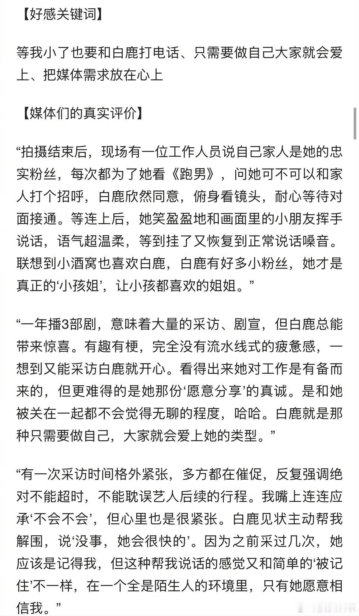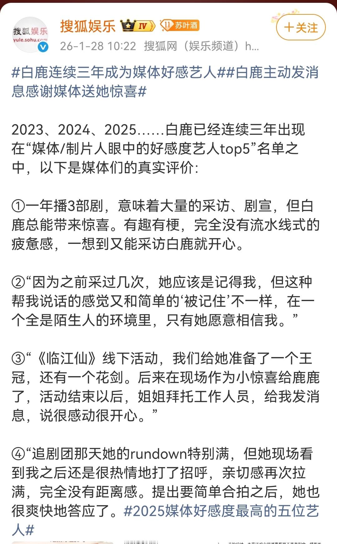 业内认证白鹿超绝吸粉体质!业内认证白鹿媒体好感度艺人!期待唐宫奇案李佩仪!我已剧荒,需要白鹿的剧来解救!白鹿连续三年成为媒体好感艺人白鹿主动发消息感谢媒体送她惊喜