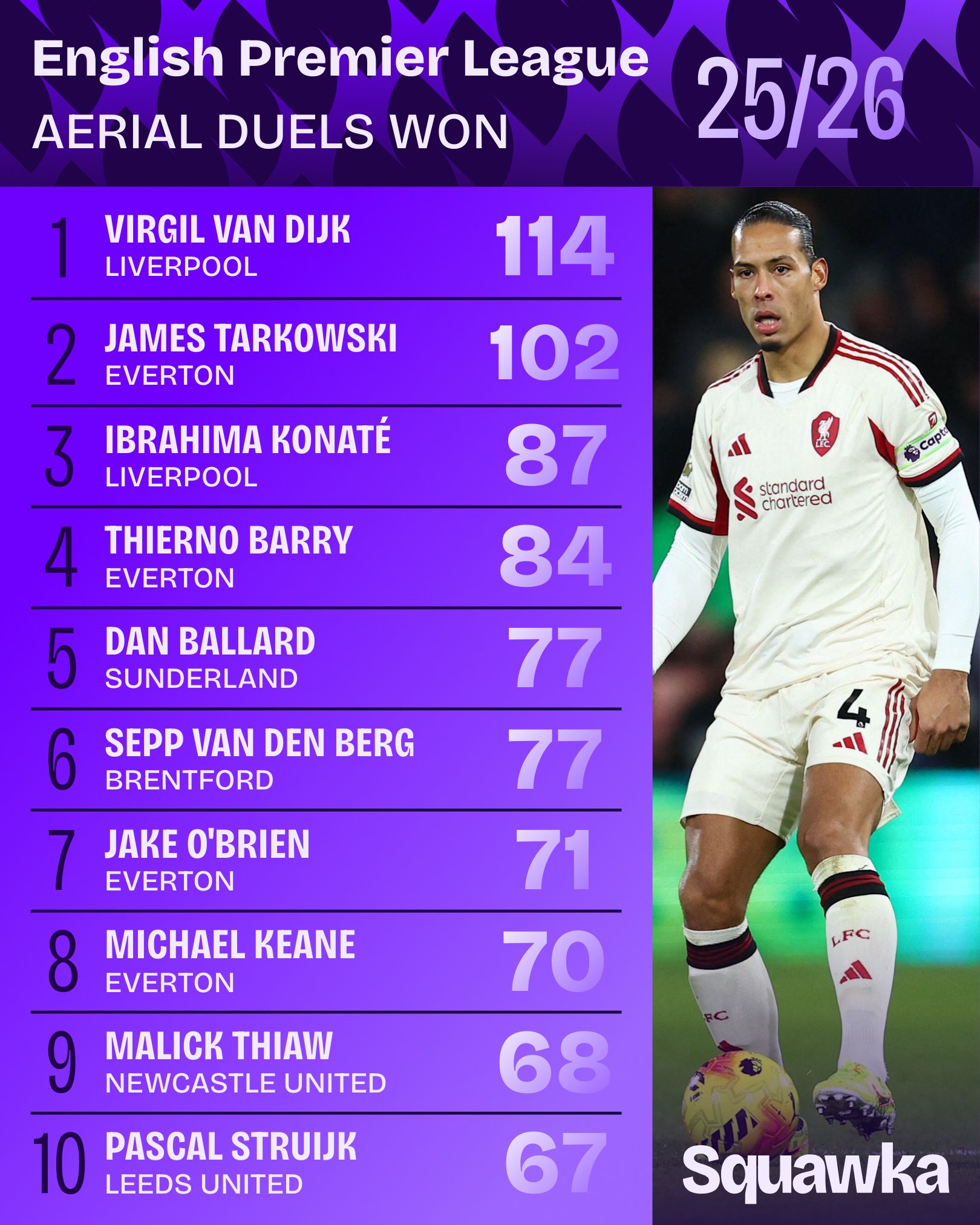 本赛季英超空中对抗成功率成功率排行(至少参与25次争顶):