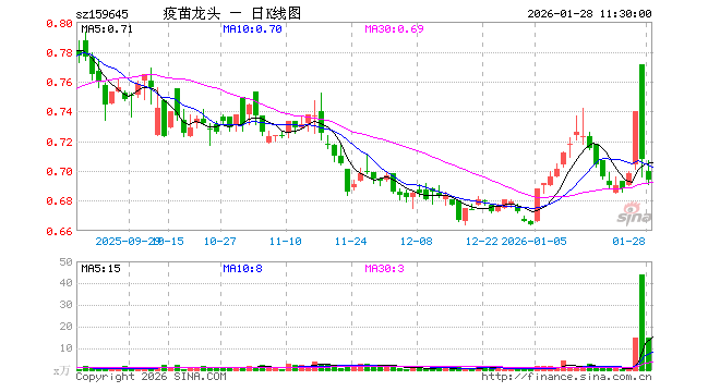1月28日,截止午间收盘,疫苗ETF富国(159645)跌1.98%,报0.694元,成交额1054.18万元。疫苗ETF富国(159645)重仓股方面,复星医药截止午盘跌1.70%,长春高新跌1.43%,智飞生物跌2.41%,沃森生物跌2.97%,万泰生物跌2.18%,华兰生物跌2.22%,昭衍新药跌1.40%,丽珠集团跌1.93%,辽宁成大涨2.39%,康泰生物跌2.59%。