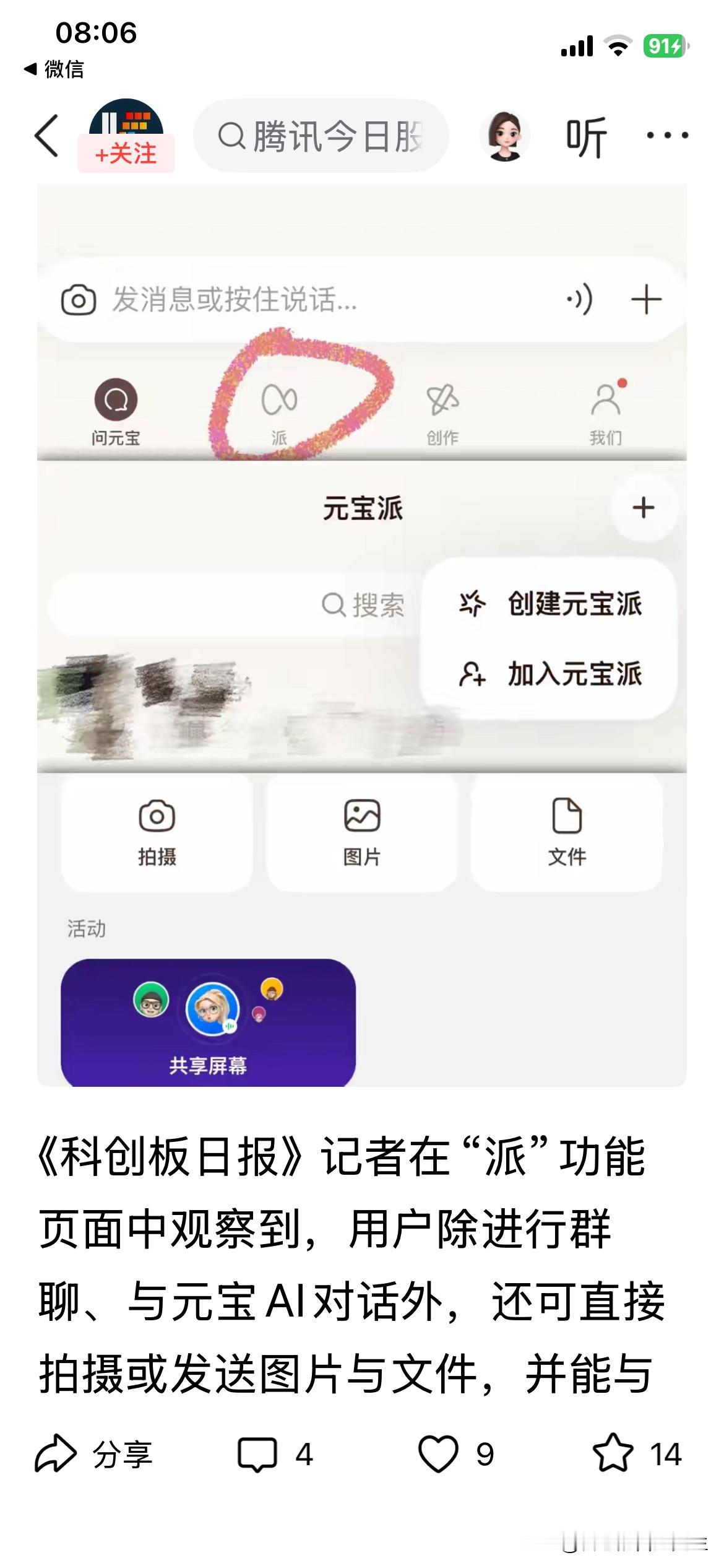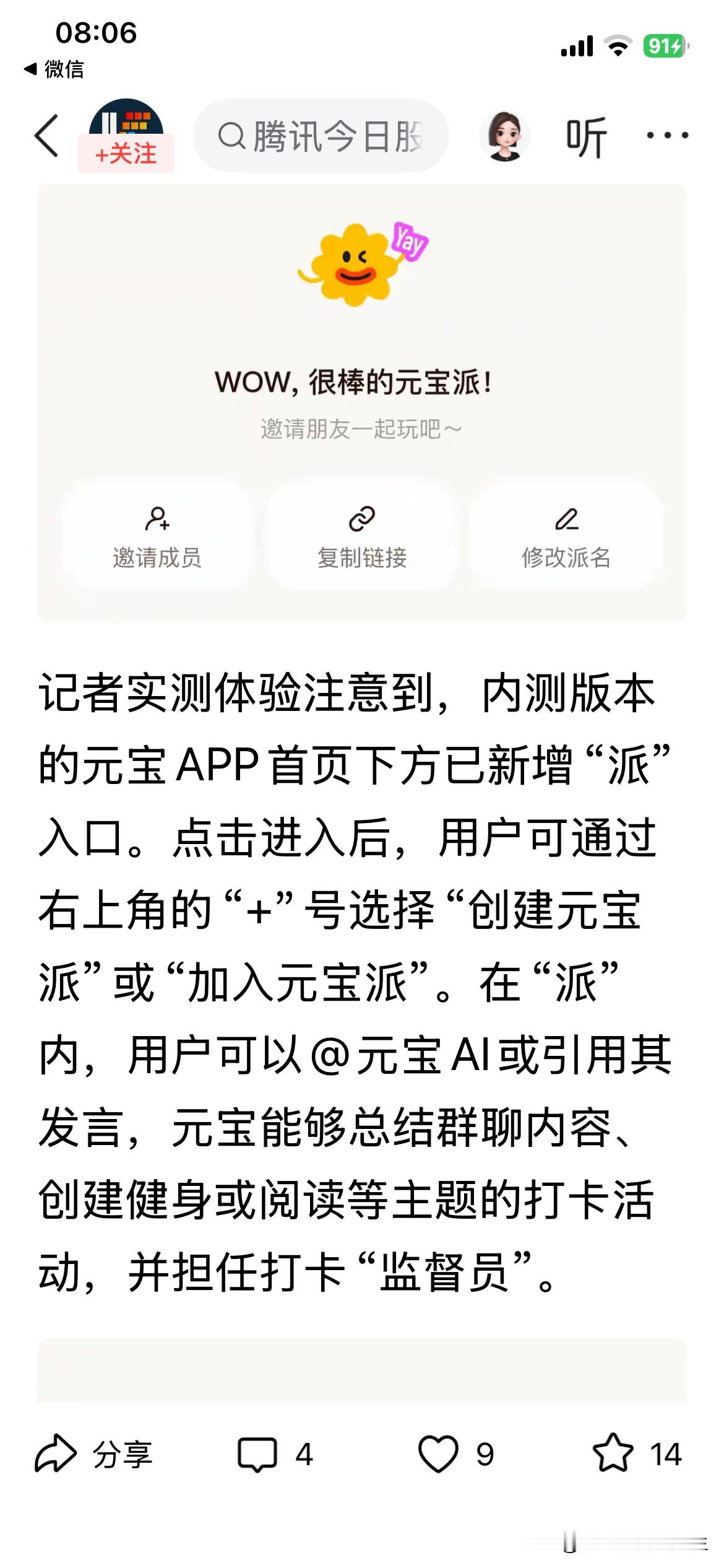 1. “元宝派”(AI社交新玩法):当前最核心的创新。类似微信群,可以邀请微信好友加入,让元宝AI作为一个成员参与群聊,实现陪聊、查资料、设定提醒等。