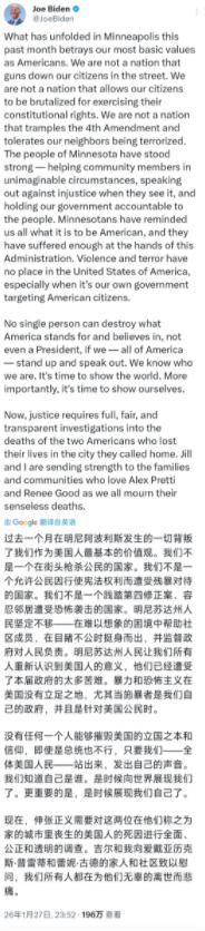 久未露面的美国前总统拜登昨晚(北京时间1月27日晚)发文批评特朗普政府:“过去一个月在明尼阿波利斯发生的一切背叛了我们作为美国人最基本的价值观。我们不是一个在街头枪杀公民的国家。我们不是一个允许公民因行使宪法权利而遭受残暴对待的国家。我们不是一个践踏第四修正案,容忍邻居遭受恐怖袭击的国家。明尼苏达州人民坚定不移在难以想象的困境中帮助社区成员,在目睹不公时挺身而出,并监督政府对人民负责。明尼苏达州人民让我们所有人重新认识到美国人的意义,他们已经遭受了本届政府的太多苦难。暴力和恐怖主义在美国没有立足之地,尤其当施暴者是我们自己的政府,并且是针对美国公民时。 拜登这话戳的不是某件事,是美国立国的根基。当联邦执法变成街头枪响,当移民执法队在零下三十度的明尼阿波利斯连杀两个美国公民,连街角监控都拍下特工围殴护士的画面——这不是简单的执法过当,是权力失控的信号。 一个月两起枪击,死者一个是三个孩子的母亲,一个是急诊室护士。ICE说他们反抗,可视频里普雷蒂被按在地上时,手里攥的是手机。 地方警察局长盯着录像反问:"你们杀了人就这么走了?美国历史上有这种先例吗?"这不是红蓝州的争吵,是最朴素的是非:当联邦特工可以在民主党执政的城市,用"自卫"解释当街射杀公民,谁还相信法律面前人人平等? 拜登说"我们不是这样的国家",这话刺痛的是美国的自我想象。第四修正案禁止无理搜查扣押,可ICE的行动像极了2020年弗洛伊德事件的重演——同样的明尼阿波利斯,同样的非裔社区,同样的执法争议。 不同的是,这次枪口对准的不只是少数族裔,还有持有合法持枪证的护士。当特朗普把责任推给"民主党煽动的混乱",等于在说:联邦暴力可以凌驾于地方自治,只要对方是政治对手。 更微妙的是权力逻辑的扭曲。特朗普要求明州交出"犯罪非法移民",可两起枪击的受害者都是美国公民。ICE的执法半径早已超出移民范畴,变成政治威慑的工具。 就像德国媒体说的,当总统把ICE当"御林军",对着民主党州挥舞大棒,美国的三权分立正在失效。 彭斯和格里沙姆这些共和党人罕见发声,不是因为良心发现,而是意识到:今天ICE能在明州开枪,明天就能在任何地方执法。 拜登的愤怒里藏着更深的焦虑。2025年校园枪击案时,特朗普还会降半旗;如今面对执法枪杀公民,他却把责任推给地方。 这种双重标准撕裂的是美国的共识——当政府可以选择性保护公民,当联邦与州的矛盾从政策分歧变成武力对峙,所谓"美国人的意义"正在沦为政治口号。明尼苏达的雪地上,躺着的不只是两个死者,还有这个国家对法治最后的信任。 最致命的是循环无解。州检察官起诉联邦阻碍调查,ICE却能直接搬走现场证据;州长要求停止行动,总统却威胁动用《反叛乱法》。 拜登说要"监督政府负责",可当联邦执法不受地方司法约束,当真相被权力掩盖,监督从何谈起? 这不是红蓝之争,是权力是否该有边界的根本问题——如果连美国公民的街头安全都要靠政党立场决定,这个国家的根基,确实在摇晃。