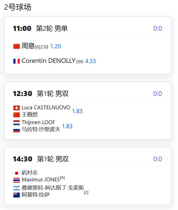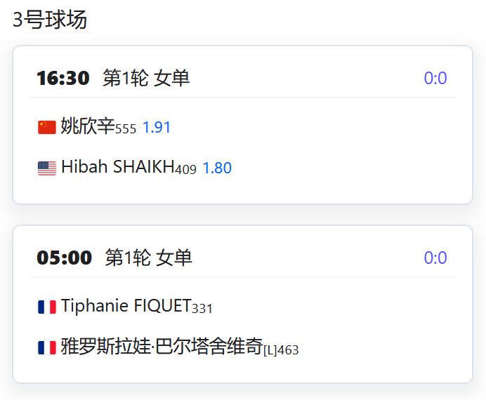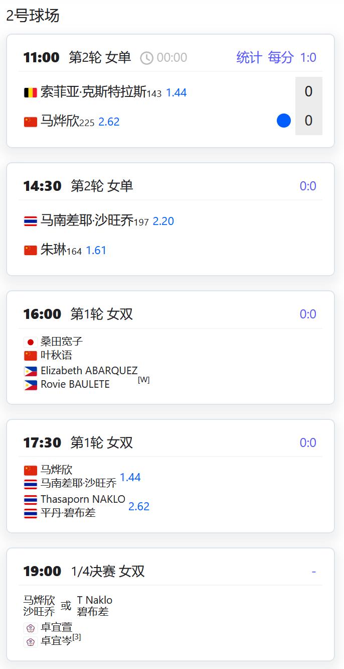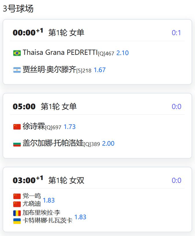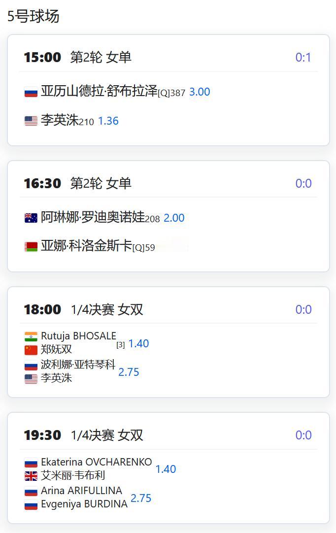 2026澳大利亚网球公开赛,女双四分之一决赛,张帅/梅尔滕斯4-6,6-4,6-3逆转吴芳娴/穗积绘莉,顺利晋级四强! 赛程: W125马尼拉,马烨欣将在女单第二轮对阵比利时的克斯特拉斯,稍事休息后还将补赛女双第一轮; 朱琳将在女单第二轮对阵泰国的沙旺乔; 叶秋语组合也将补赛女双第一轮,若晋级将对阵头号种子美国组合; W100富吉拉,郑妩双/波塞勒将在女双四分之一决赛对阵亚特琴科/李英洙; W75维罗海滩,尤晓迪将在女单第一轮对阵资格赛球员泽巴洛斯; 从资格赛突围的徐诗霖将对阵托帕洛娃; 党一鸣/尤晓迪将在女双第一轮对阵加布里埃拉/扎瓦茨卡; CH50藩切,周意将在男单第二轮对阵德诺利; 男双第一轮,孙发京组合将对阵庄吉生/上杉海斗; 王傲然组合将对阵卢弗/沙里波夫; W50莫纳斯提尔,女单第一轮,姚欣辛对阵SHAIKH。