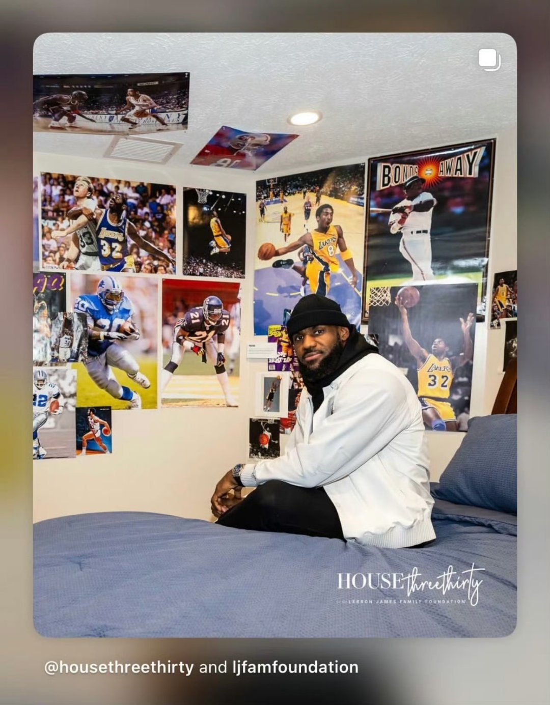 詹姆斯和自己的儿时房间合影,一眼望去,全是湖人。