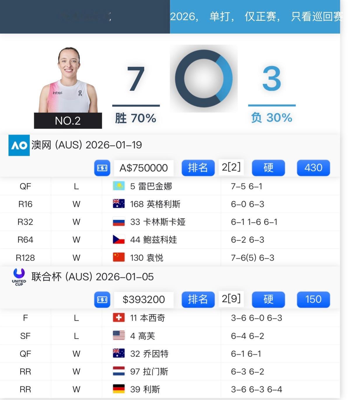 斯瓦泰克2026赛季已输掉3场比赛!联合杯2负斯瓦泰克0:2高芙斯瓦泰克1:2本西奇澳网1负斯瓦泰克0:2莱巴金娜这很澳网澳网2026