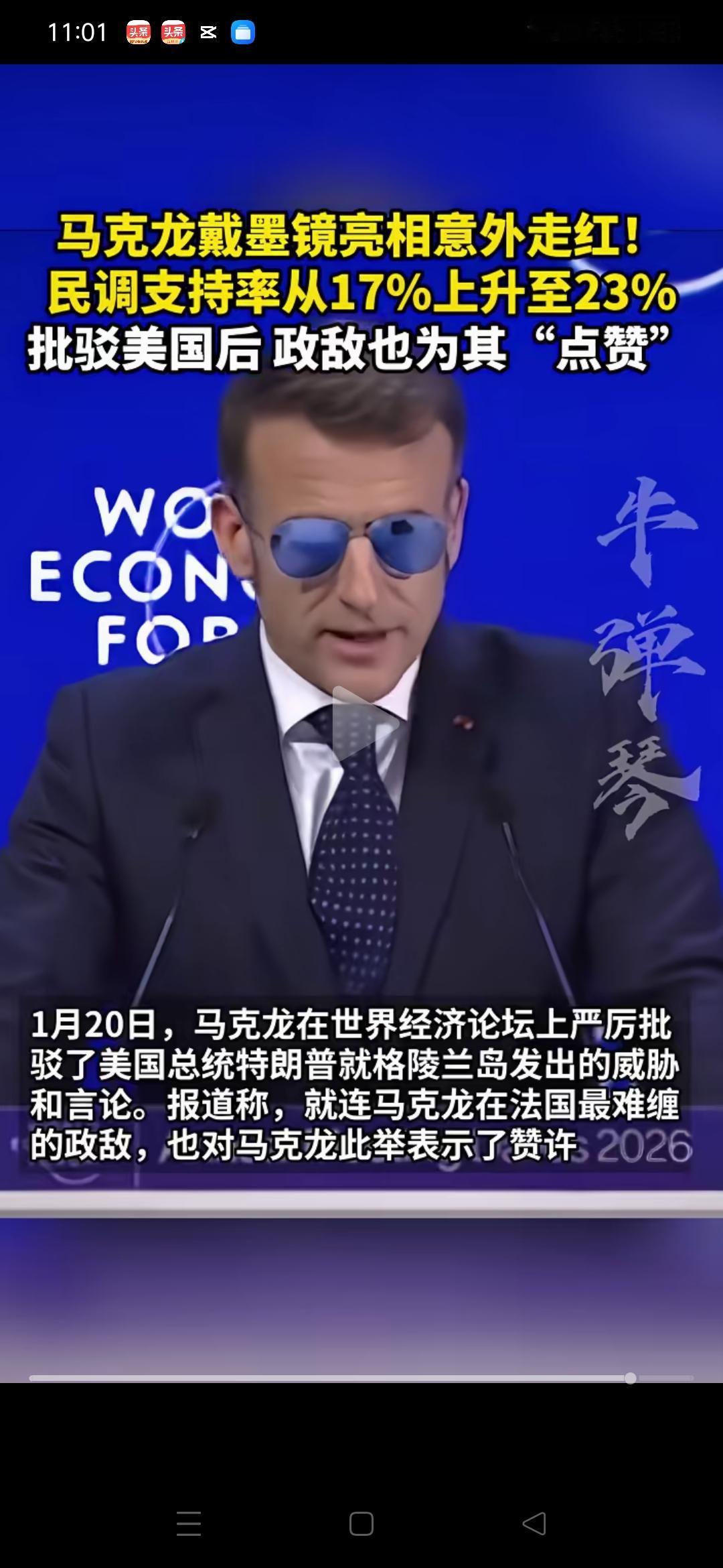 马克龙戴墨镜帅呆,戴墨镜骂特朗普,支持率飙升!​奇怪,西方政客为啥不骂中国改骂美国了? 人说不定啥时候出名!马克龙因眼疾戴墨镜现身达沃斯,意外塑造“硬汉人设”刷屏全网,再加上怒批特朗普“关税霸凌”,支持率从17%蹿升至23%。 有人说西方政客变了,从“骂中国”开始转向“骂美国”,其实真相没那么简单。 不是不骂中国了,而是反美更划算。特朗普的“美国优先”政策收割欧洲产业,欧洲民众对美怨气积压已久,马克龙骂美国,是反应民意。 而“骂中国”效果降低,因为已经找不到骂中国的话题了,再编,民众不相信了。同时还会损害欧洲企业对华贸易,民众已经反感。 说到底,西方政客的嘴,都是为选票服务的。骂谁、捧谁,看的从来不是立场,而是哪个话题能最快拉到选票。 马克龙戴墨镜骂美国 欧盟反击特朗普 特朗普外交风格与中美关系的未来