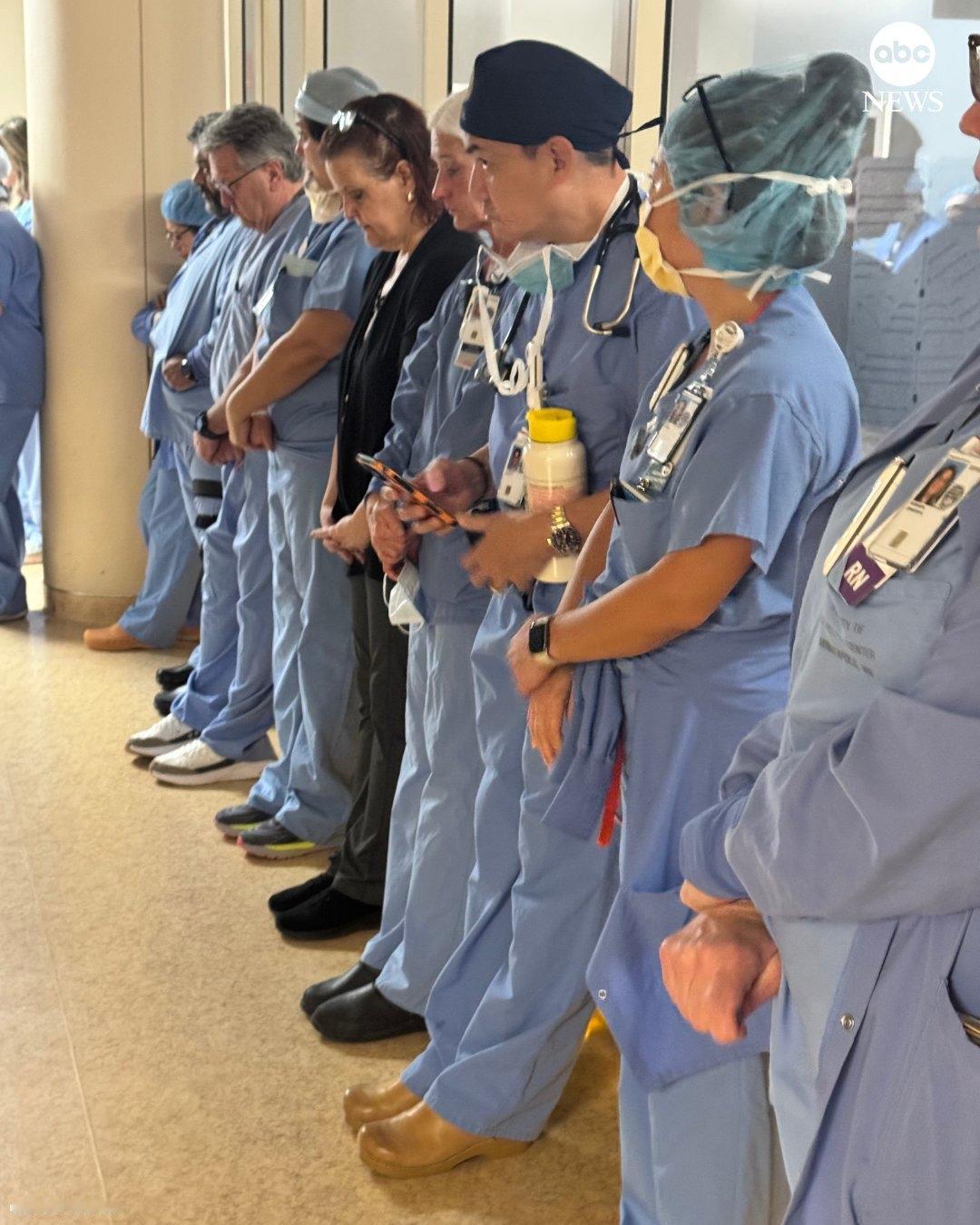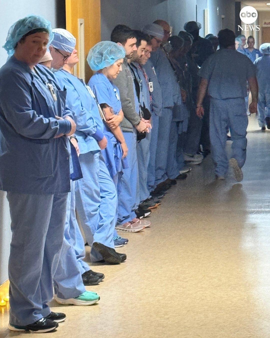 在亚历克斯·普雷蒂生前工作的明尼阿波利斯退伍军人医疗中心拍摄的照片显示,当地时间周一,医护人员为悼念这位已故同事默哀。