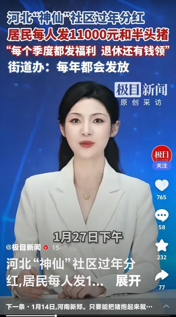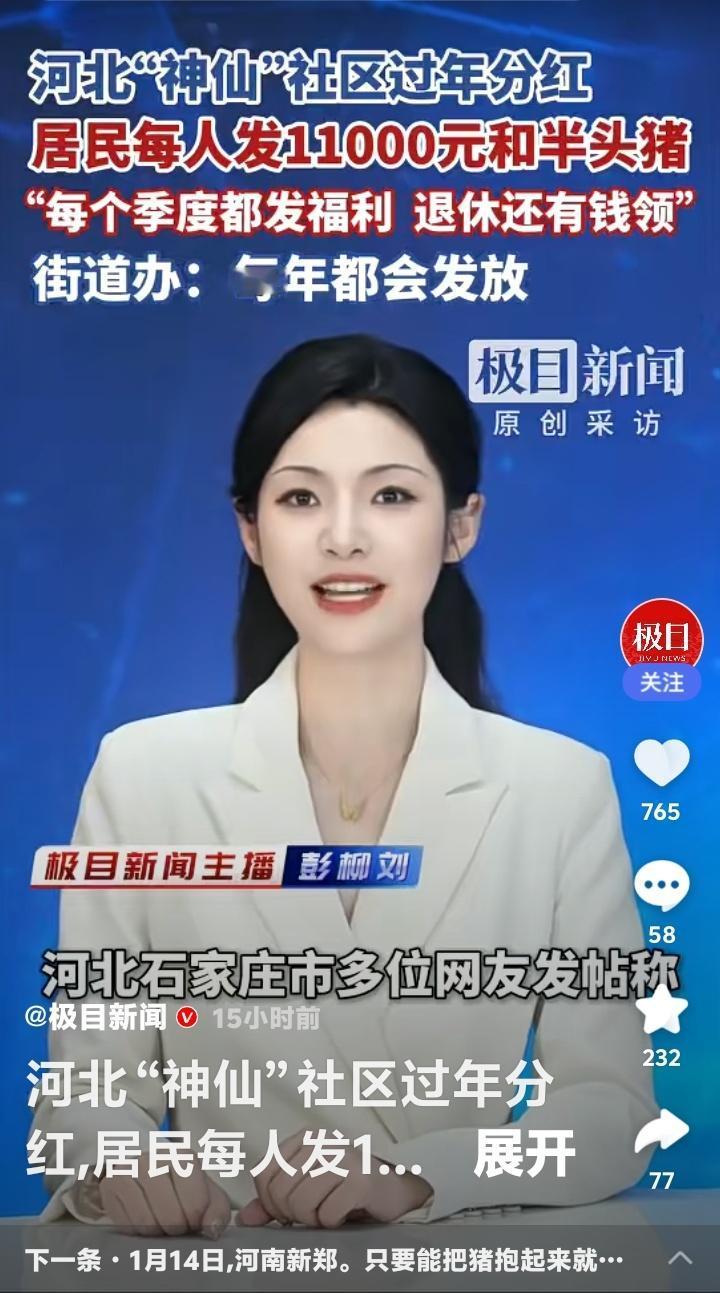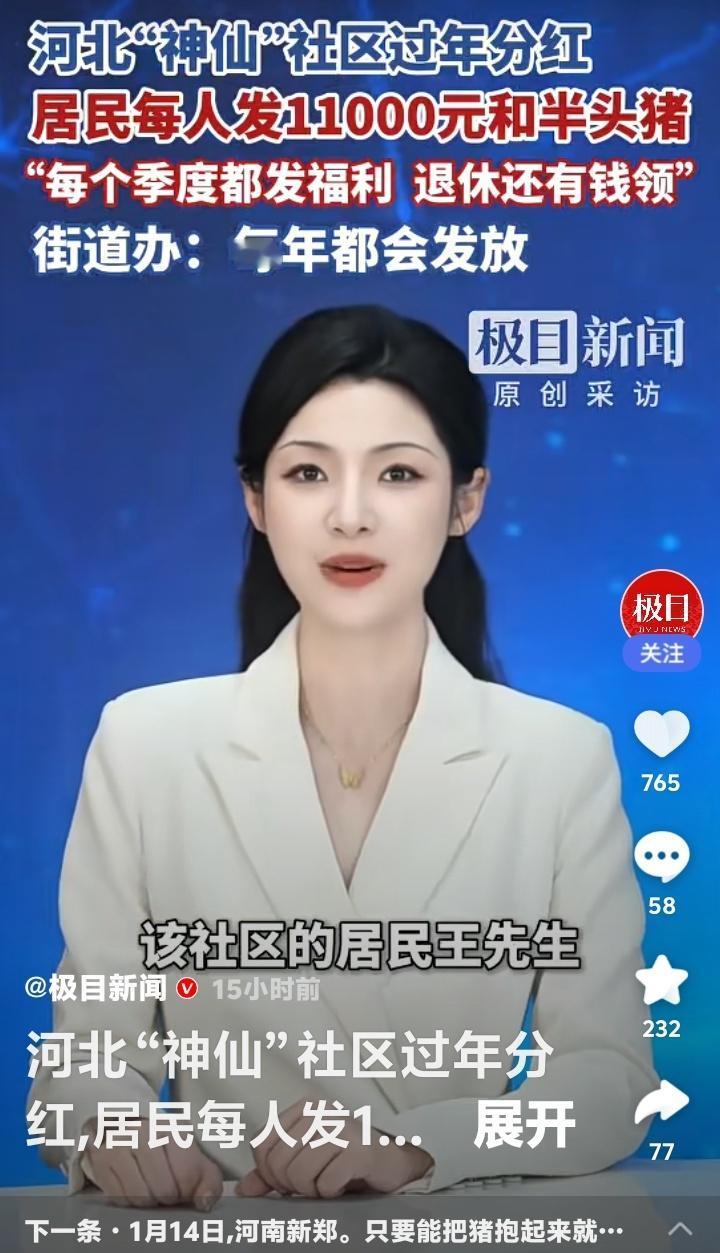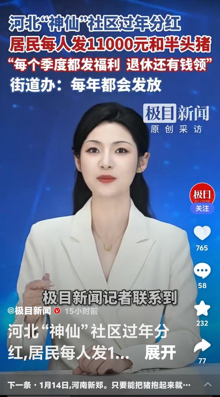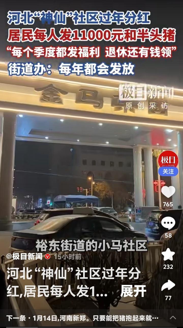 河北石家庄“神仙社区”过年豪横分红!每人万元现金加半头猪,季度福利不断,退休还有钱领,网友直呼:这街道办是“财神爷”下凡吗? 当全国网友还在为年终奖发愁时,河北石家庄裕东街道小马社区的居民已经笑着领走了过年“大礼包”——每人11000元现金和半头猪。这不是传说,而是每年腊八节准时上演的“神仙操作”。社区门口排起长队,领福利的车多到堵路,这场景让外地人看得眼热心跳。 凭什么他们能如此“豪横”?秘密藏在社区的股份制模式里。土地集体经营、资产共同盘活,让这个曾经的普通社区蜕变成“共同富裕”的样板。居民不仅是住户,更是股东,每年分红就像收租一样稳当。这背后,是一套让集体资产滚雪球般的智慧。 更让人羡慕的是,这万元红包和半头猪只是过年“彩蛋”。平日里,米面油、肉蛋奶按季度发放,退休居民每月还能领牛奶鸡蛋加补贴。福利不断档,生活有保障,难怪年轻人不慌不忙,老年人笑口常开。这不是施舍,而是共享发展果实的尊严。 翻看网友评论,“别人家的社区”“求街道办地址”的呼声刷屏。但鲜少有人追问:为什么他们能做成?其实答案很简单——集体资产透明运营,利益分配公平公开。社区干部不是“管家”,而是“服务员”,每一分钱都花在居民身上。这种模式,比任何口号都更有说服力。 也有网友质疑:“是不是拆迁暴富?”“城中村老本罢了”。但事实上,许多拆迁村一夜暴富后坐吃山空,而小马社区却让财富持续增值。这不仅是运气,更是长远眼光和治理能力的体现。他们分的不只是钱,更是一份可持续的安心。 站在普通人的视角,这种新闻之所以“扎心”,是因为它触碰了我们心底最朴素的渴望——劳动有回报,居住有归属,老去有保障。当越来越多社区用行动证明“共同富裕”不是空话,我们期待的,或许是这份踏实能蔓延到更多角落。 小马社区的故事像一面镜子,照见的是基层治理的温度与智慧。它不煽情,却让人共鸣;不说教,却催人思考。如果每个社区都能成为居民的“靠山”,那么万家灯火里,自然会多更多从容的笑脸。 (来源:极目新闻原创采访) 社区分红 共同富裕