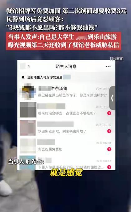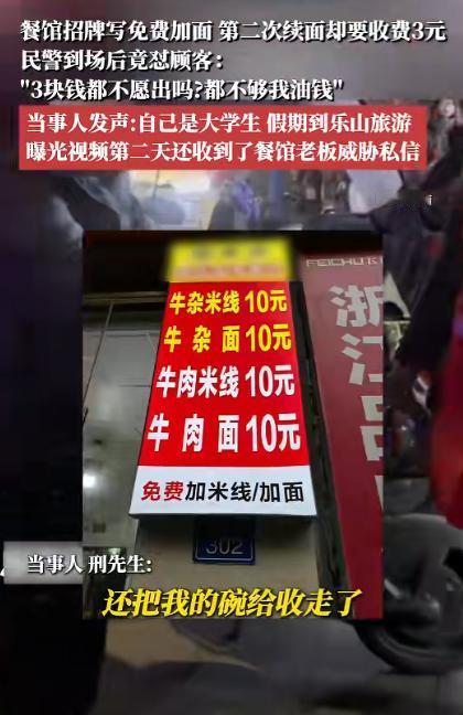 大学生去乐山的一家店铺吃面,面馆招牌写免费加面,可他第二次续面却要收费3元!大学生不服,可民警来了以后,居然帮着老板怼大学生:“你3块钱都不愿出吗?这点钱还不够我开到这里的油钱!” 假期揣着攒下的零花钱去乐山逛吃,本想尝一口当地地道的川味面,结果因为续面的事儿闹到报警,民警的一句话让心里堵得慌,转头还收到面馆老板的威胁私信,这趟乐山之行,让这名外地大学生直呼体验感跌到了谷底。 这名大学生趁着假期从外地来到乐山,早就听闻这座城市是名副其实的美食之都,除了乐山大佛的盛景和甜皮鸭的香糯,街头巷尾的小面馆里,藏着最地道的本地滋味。 逛到这家面馆时,他一眼就看到门口醒目的招牌上写着 “免费加面” 的字样,一碗面标价 10 元,想着性价比超高,便推门走进了店里,选了一碗面,找了个空位坐下,看着店里来来往往的食客和老板忙碌的身影,满心期待着这口本地美味。 面端上桌后,分量不算大,汤底麻辣鲜香,面条筋道入味,大学生几口就吃完了,想起门口招牌上的免费加面,便随口跟老板说了一声要续面。 老板当时没多说什么,很爽快地就给加了一碗,这时候大学生还觉得这家店果然实在,心里暗喜选对了地方,吃完第二碗面。 他还是觉得没吃过瘾,想着反正招牌明明白白写了免费加面,便又跟老板提了第二次续面的要求,可没想到就是这一次提要求,让原本平和的氛围瞬间变得紧张起来。 听到大学生要第二次续面,老板立马摆了摆手,明确表示第二次续面要额外收 3 块钱,大学生当时就愣住了,他指着门口的招牌跟老板理论,说招牌上只写了免费加面,根本没标注只能加一次。 老板却当场反驳,称乐山当地的面馆都是这个规矩,免费加面只算一次,第二次再续面肯定要收费,还说大学生是外地游客,不懂本地的行规,两人就这么你一言我一语争执起来。 声音越来越大,不仅引来了店里其他食客的目光,还吸引了路过的本地人围观,几个围观者开始七嘴八舌地议论。 大学生觉得自己占理,掏出手机想着要打 12315 投诉,维护自己的消费权益,结果他刚拿出手机,老板反倒先一步报了警,声称大学生在店里无理取闹,影响自己正常做生意。 大学生当时特别无奈,只能站在店里等着民警过来,心里还想着等民警来了,总能评个公道,毕竟招牌的表述模糊,明显存在误导消费的嫌疑,自己只是想要一个说法,并不是真的在乎那 3 块钱。 没过多久,民警就开着警车赶到了面馆门口,走进店里后先是向双方了解情况,大学生先把事情的前因后果完整跟民警说了一遍,还拉着民警走到门口,指着那块写着 “免费加面” 的招牌。 老板也在一旁不停辩解,说自己做的是小本生意,一碗面才卖 10 块钱,免费加一次面已经没什么利润了,第二次再免费根本赚不到钱,还反复强调当地的同行都是这么做的,这是面馆行业不成文的行规。 民警听完双方的说法后,转头对着大学生说出的话,让他瞬间心凉,民警说,3 块钱都不愿出吗?这点钱还不够我开到这里的油钱! 这句话一出,大学生当场就懵了,他怎么也没想到民警会说出这样的话,心里的委屈和气愤一下子涌了上来。 他又跟民警反复强调,这根本不是钱的问题,是商家的招牌没写清规则,属于商家的问题,可民警却显得有些不耐烦,还说要不自己帮大学生出这 3 块钱,别再在店里吵了,免得影响其他食客吃饭。 回到住的地方,大学生越想越气,便把自己的这段经历整理了一下,拍了一段视频发布到了网上,视频里不仅清晰讲述了事情的经过,还拍下了面馆门口写着 “免费加面” 的招牌。 还有当时和老板、民警的部分对话片段,他只是想把这件事说出来,问问大家到底是谁的问题,没想到视频发出去后,很快就引起了网友的关注,大家纷纷在评论区留言讨论,这件事也慢慢在网上发酵起来,成了网友们热议的话题。 可让大学生万万没想到的是,视频曝光的第二天,他的社交软件就收到了面馆老板发来的私信,私信里的话带着明显的威胁意味。 之后这名大学生再次在网上发声,讲述了自己被老板威胁的经历,还把威胁私信的截图一起放了出来。 这下网上炸锅了,网友们直接在评论区里开喷店家,甚至有人直接跑到乐山文旅下面阴阳怪气,大部分人都表示说了店家自己标了免费加面,后面又玩不起,实在是太掉价了。开不起店就别开,不想让人续面就别写免费续面。 出门在外旅游,人们经常会遇到这种消费规则模糊的情况,特别影响旅游体验,希望各地的商家都能诚信经营,把消费规则明明白白写清楚,不要搞这种模糊的表述来吸引顾客。 对于这件事,您有什么想说的吗?欢迎评论区留言讨论。 信源:凤凰网安徽2026-01-27——《1月27日消息,四川乐山,餐馆招牌写免费加面,第二次续面却要收费3元……》