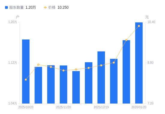 日期A股户数(户)流通A股户均持股数(股)户均持股市值(万元)2026-01-201199615484.6815.872026-01-091164615950.0415.472025-12-311128016467.5714.512025-12-191142516258.5814.142025-12-101121216567.4514.252025-11-281103816828.6114.372025-11-201114916661.0714.162025-11-101115116658.0814.392025-10-311112116703.0114.582025-10-201165915932.2612.97