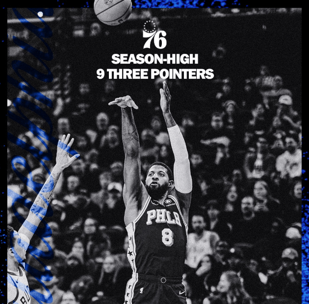 乔治本场投进9个三分砍下32分,单场9记三分生涯单场第二高三分命中数。