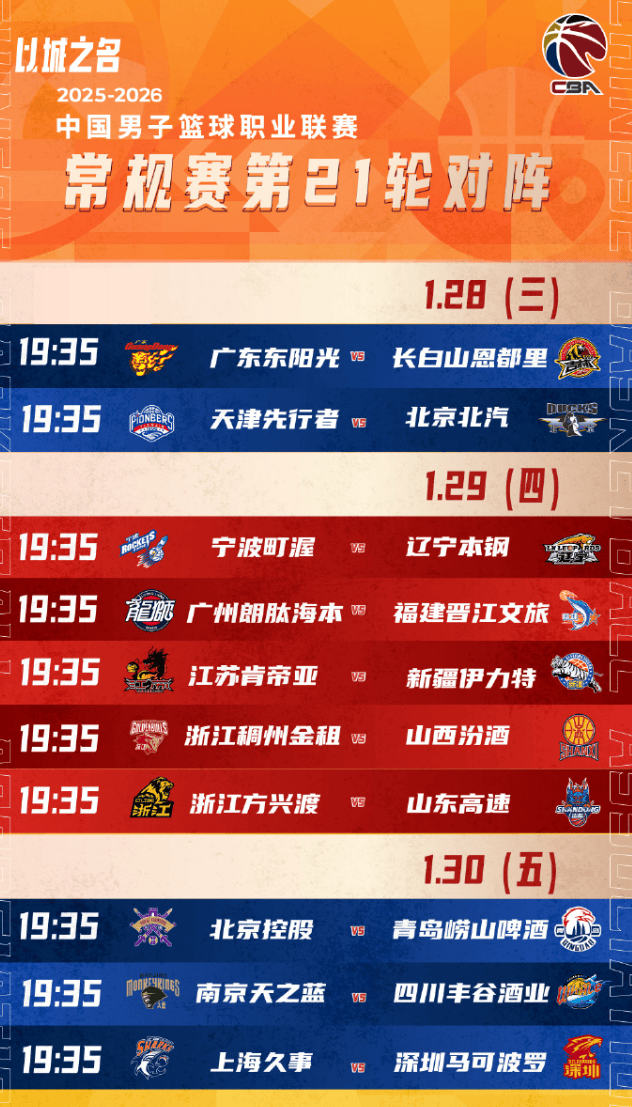 CBA官方分享常规赛第21轮赛程:广厦vs山东,上海vs深圳