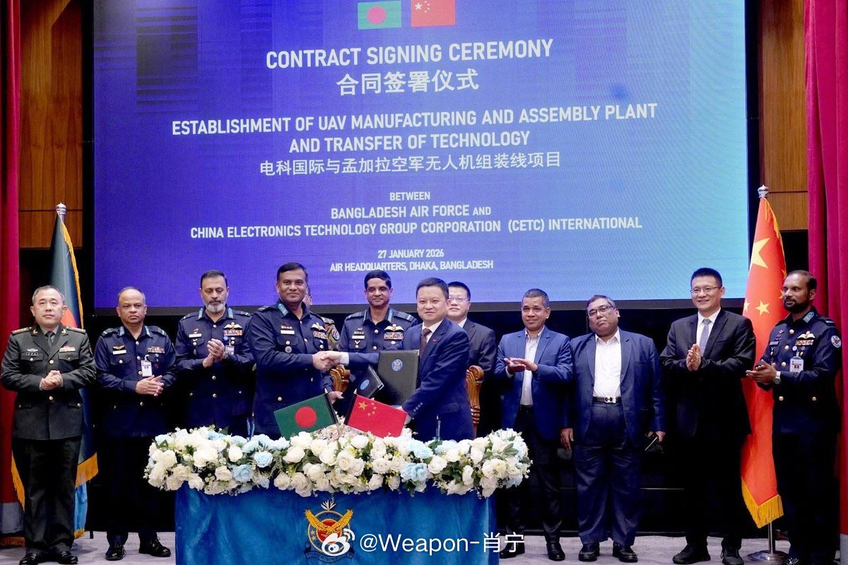 烽火问鼎计划 孟加拉采购中国电子科技集团有限公司(CETC)的翔云-I无人机,该机还将在孟加拉本地生产。土耳其人气坏了。 外媒报道:孟加拉国将生产军用无人机:与中国签署突破性协议一座新的无人机制造厂将在博格拉建立,并进行全面技术转让。该厂将生产中空长航时(MALE)、垂直起降(VTOL)和国产无人机,用于国防、人道主义援助和灾害管理。孟加拉国空军(BAF)已与中国国有企业中国电子科技集团公司(CETC)国际有限公司签署了一项政府间(G2G)协议。根据该协议,将在孟加拉国建立一座军用无人机(UAV)生产和组装厂,其中包括全面技术转让。该协议于周二(2026年1月27日)签署,名为“无人机(UAV)制造厂建设及技术转让协议”,将在提升孟加拉国国防能力和降低进口依赖方面发挥重要作用。该项目将生产中空长航时(MALE)、垂直起降(VTOL)及其他国产无人机,这些无人机不仅将用于军事行动,还将用于人道主义援助、灾害管理、救援行动和边境监视。工厂将建在博格拉新建的空军基地,这将为当地工程师提供培训机会并创造就业机会。根据合同的财务细节,该项目总成本为60.807亿塔卡(约合4980万美元),经谈判后从最初提出的64.361亿塔卡降低。其中,57.06亿塔卡将用于进口和安装,这笔款项将通过信用证在四个财政年度(2026-2027财年至2028-2029财年)内支付。剩余的37.47亿塔卡将用于支付增值税、银行手续费等本地费用。财政部于2026年1月6日批准了该项目,协议于1月12日或之后签署。该项目意义重大,体现在诸多方面。它将有助于提升孟加拉国的军事能力,尤其是在空中监视和作战效率方面。国内生产将降低进口成本,创造未来的出口潜力,实现本地技术的产业化并创造就业机会。此外,该项目还能确保人道主义援助和灾害管理方面的自给自足,这对国家安全和国家发展至关重要。军事专家称该项目是孟加拉国国防工业的突破性进展。与中国的这项技术和生产合作将提升孟加拉国在南亚的地缘政治地位。目前,工厂选址、基础设施建设和本地工程师培训工作已经启动。中国电子科技集团公司(CETC)已在进行技术转让。