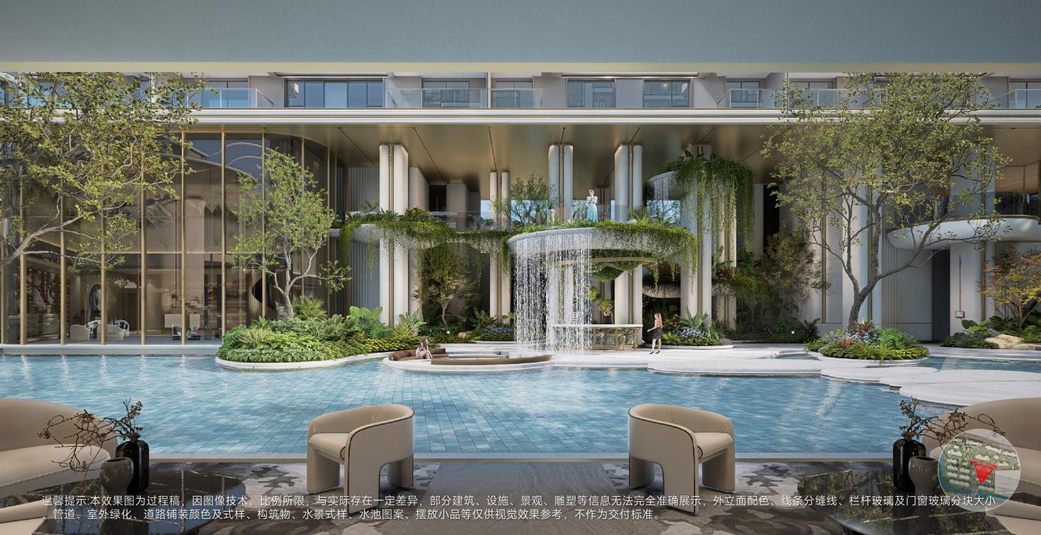 而与这片水院无界联动的,是同样下沉式打造的约2000㎡奢享会所。在健身房挥汗时,抬眼便是园林水景;在私宴厅相聚时,窗外即是瀑布叠影。水,在此是流动的风景,更是串联起自然体验与圈层生活的情感纽带。