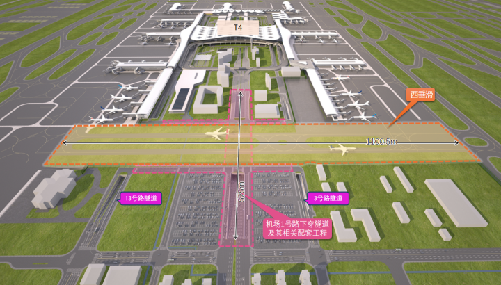 机场1号路隧道上方即为正在建设的西垂滑工程。西垂直滑作为连接机场南北跑道的主干道,核心功能是提升航空器在地面的滑行效率,有效缩短滑行时间,实现“少绕行”。