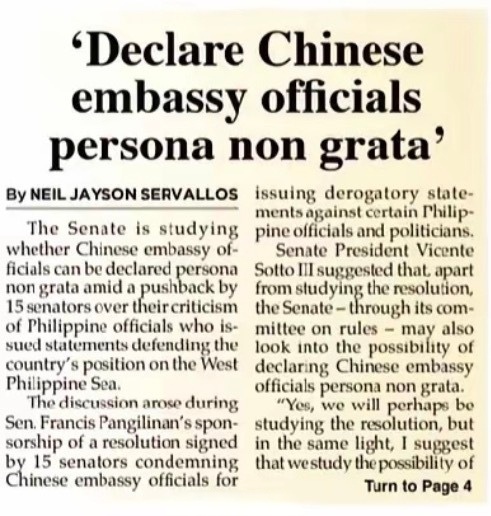 菲律宾参议院正在研究是否将中国大使馆官员列为不受欢迎的人《菲律宾星报》头版:菲律