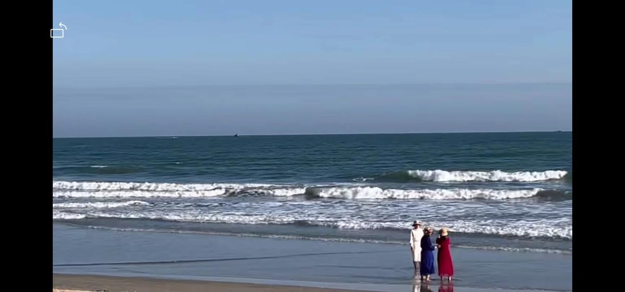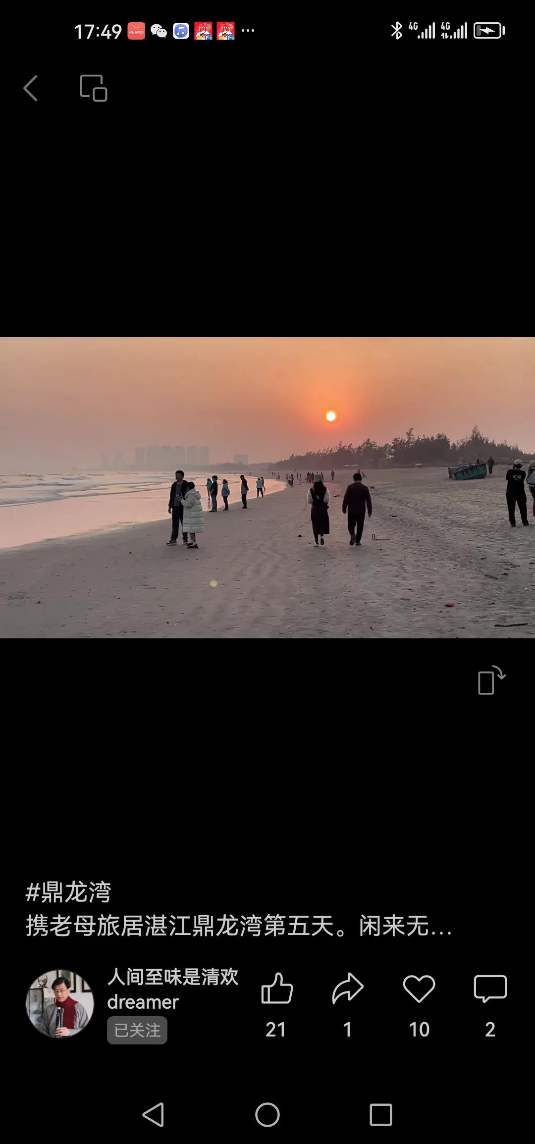 携老母旅居湛江鼎龙湾第五天。闲来无聊遂将所观所感套改《外婆的澎湖湾》表达: (人间至味是清欢) 晚风轻拂鼎龙湾,白浪逐沙滩, 没有椰林缀斜阳,只是一片海蓝蓝。 倚在民宿露台上,一次次眺望。 只见黄昏的大海边,散步人儿多成双 那是老公牵着妻,将她手轻轻挽, 还有顽童拿小铲,玩耍在沙滩上。 无数脚迹印浪漫,享受悠闲时光, 直到夜色吞没视野,还有海浪在吟唱。 鼎龙湾,鼎龙湾,湛江的好地方! 有着许多的南国风情, 阳光、沙滩、海浪、度假房! 还有一位俺老娘!