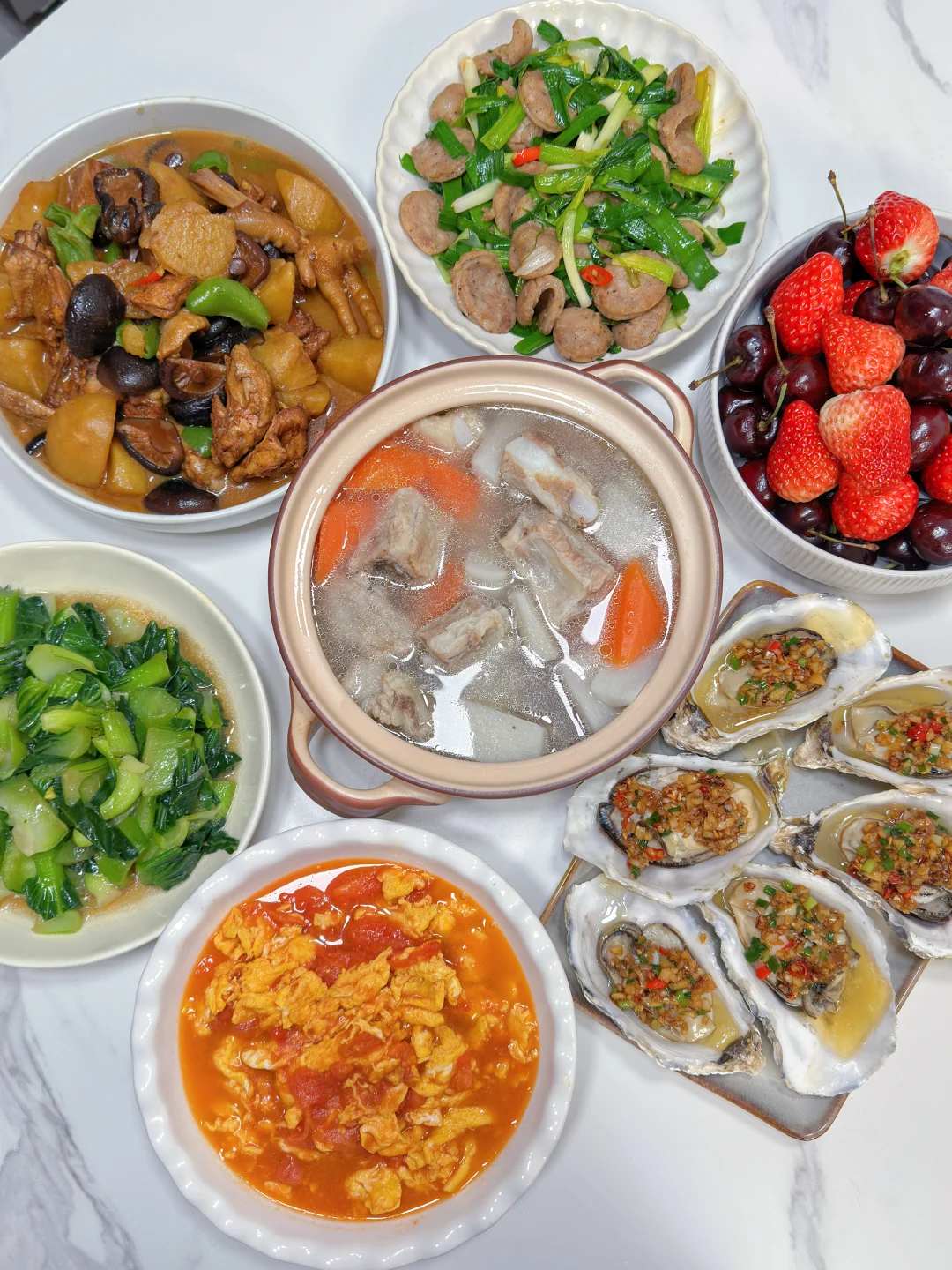 🍃每天都要记得按时吃饭哦 今天是一周不重样晚餐分享合集,给不知道每天吃什么的朋友做一下参考~~ 💕新手小白也能hold 住的菜系 🌈做法在往期笔记都有发,喜欢的可以🔍 1️⃣莲藕炒牛肉➕平菇骨头汤➕蒜香空心菜 2️⃣辣椒炒肉➕清炒油麦菜➕蒜香鸡爪 3️⃣红烧排骨➕花菜炒肉➕青椒茄子 4️⃣油面筋塞肉➕蒜黄炒豆干➕青菜炒香菇 5️⃣红烧鸡翅➕凉拌茄子➕炒青菜 6️⃣葱油河虾➕土豆炒肉丝➕蒜蓉油麦菜 7️⃣香菇土豆烧鸡➕番茄炒蛋➕蒜蓉生蚝➕青蒜炒香肠➕山药胡萝卜排骨汤