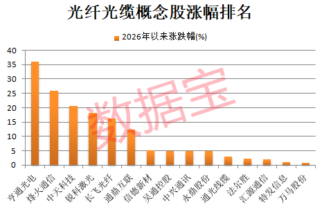 据证券时报·数据宝统计,A股市场涉及光纤光缆行业的公司数量较少,合计不到20家。截至1月28日收盘,今年以来光纤光缆概念股平均上涨9.72%,跑赢同期上证指数5个百分点以上。亨通光电、烽火通信、中天科技、锐科激光、长飞光纤、通鼎互联6股累计涨幅超10%。