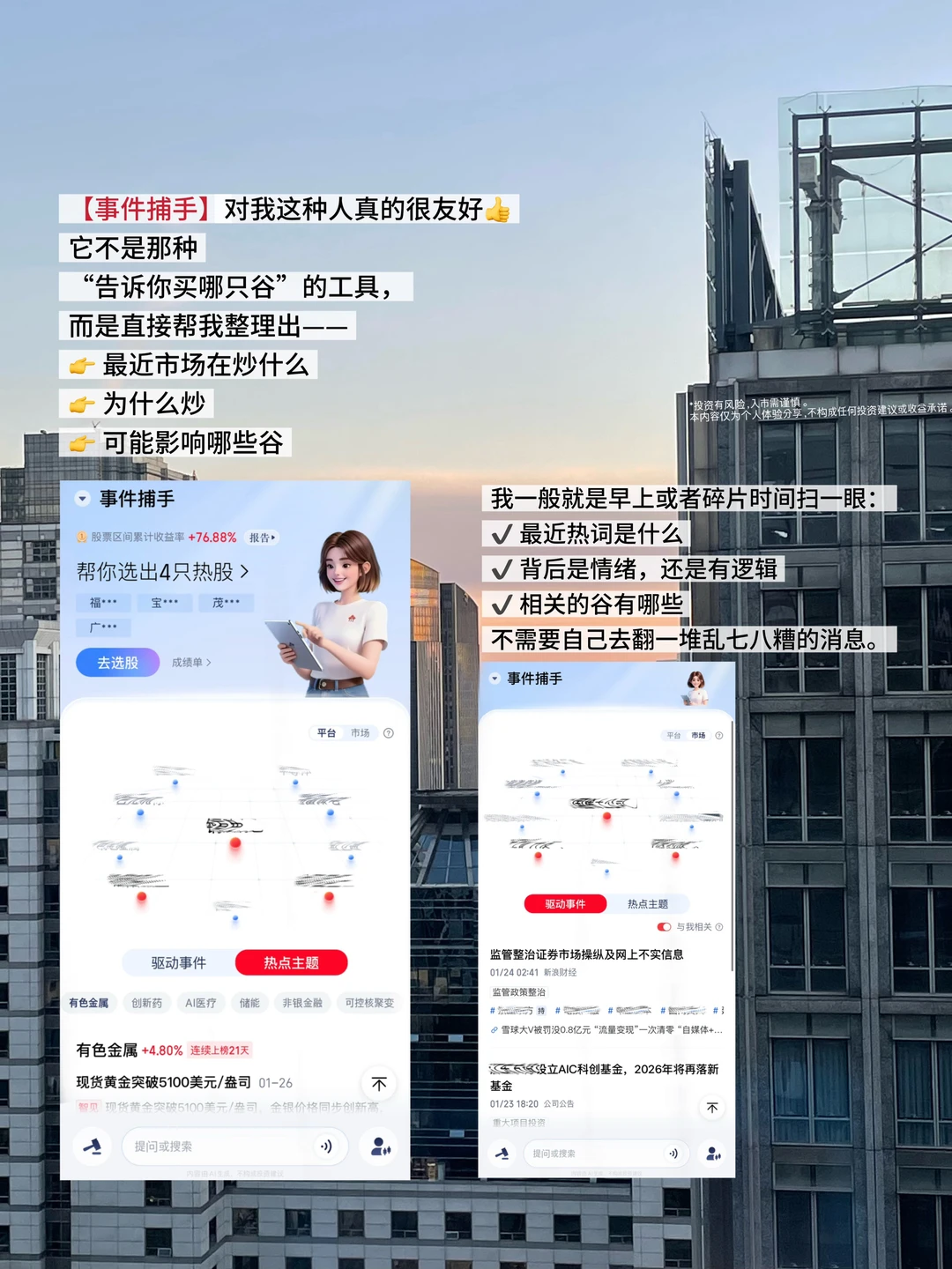【事件捕手】真的很友好:它不是那种“告诉你买哪只股”的工具,而是直接帮我整理出最近市场在炒什么?为什么炒?可能影响哪些股等等;