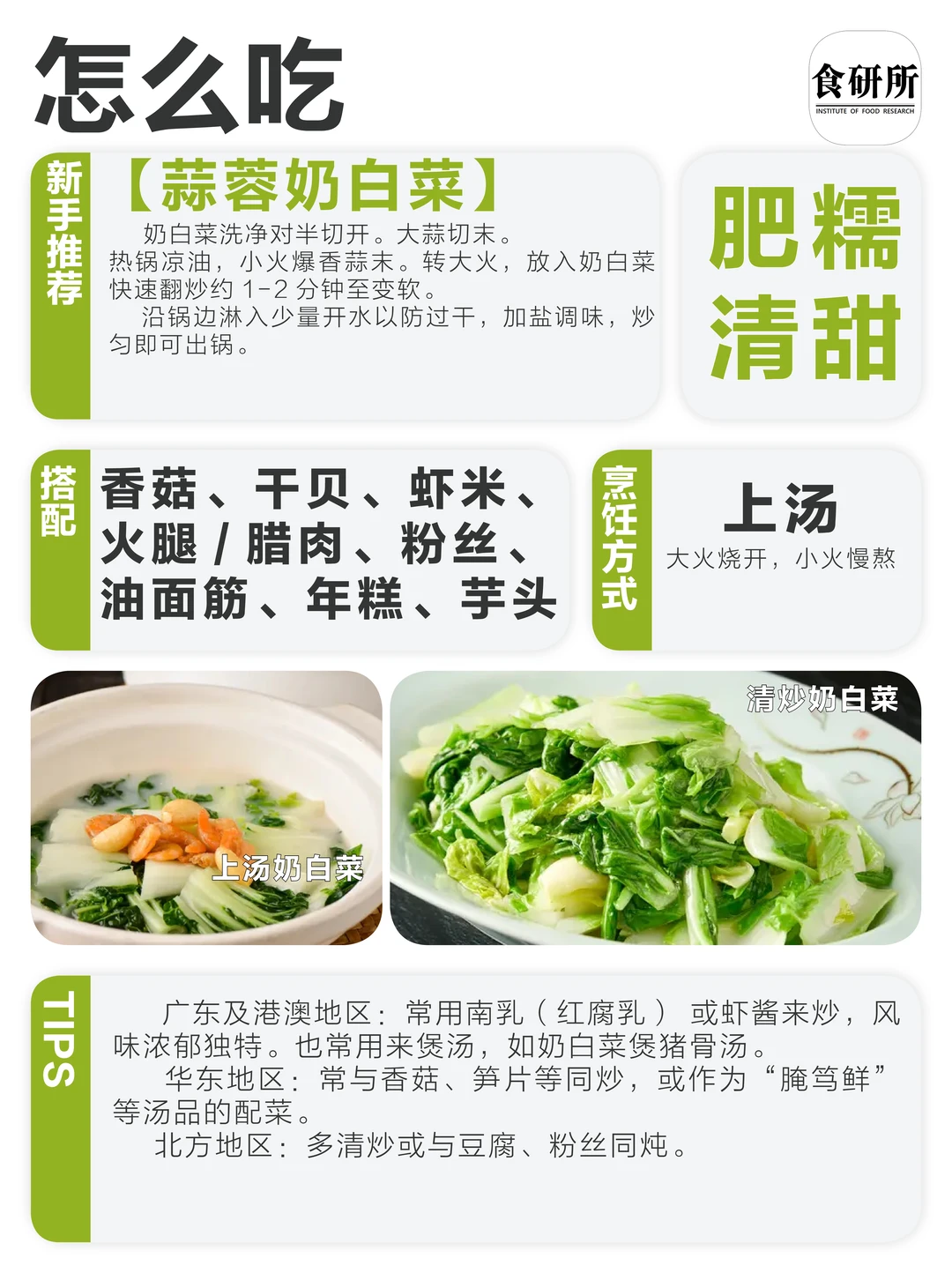 [浅肤色R]广东及港澳地区:常用南乳(红腐乳) 或虾酱来炒,风味浓郁独特。也常用来煲汤,如奶白菜煲猪骨汤,清热下火 。