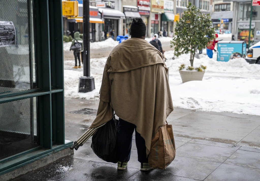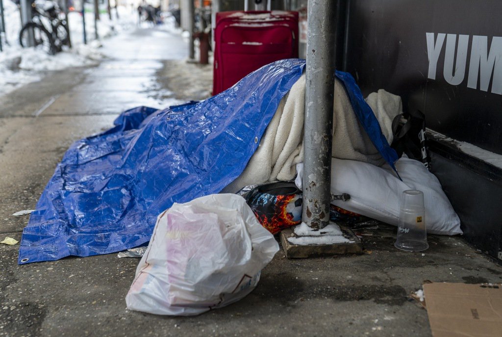 1月26日,美国纽约曼哈顿,一名流浪者在人行道上睡觉。