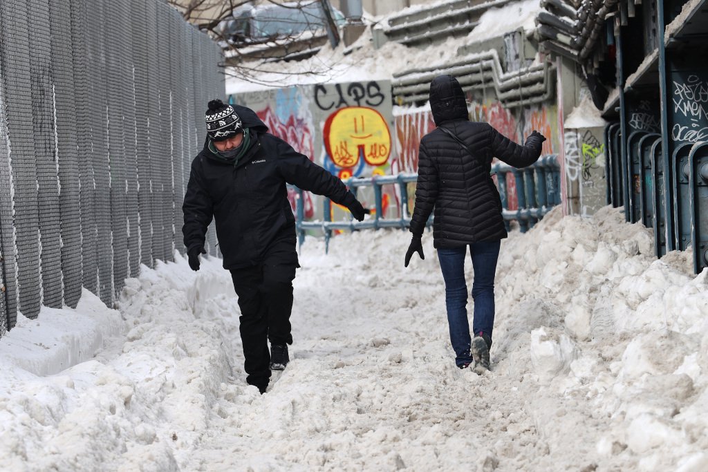 1月25日,美国纽约,人们在第六大道上冒雪前行。