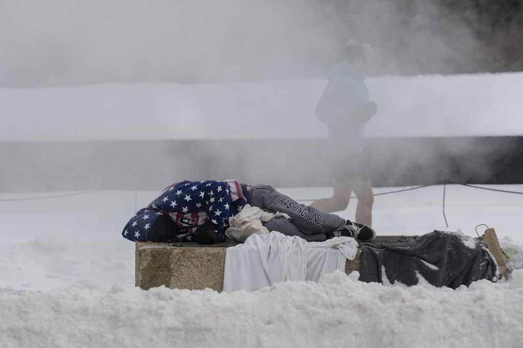 1月26日,美国华盛顿,国家非裔美国人历史文化博物馆附近,一名无家可归者睡在暖气通风口处取暖。