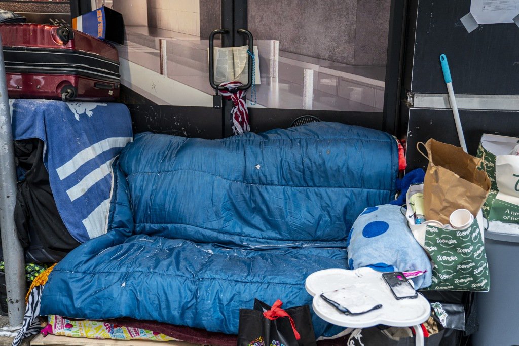 1月26日,美国纽约曼哈顿,人行道上可见一名无家可归者的物品。