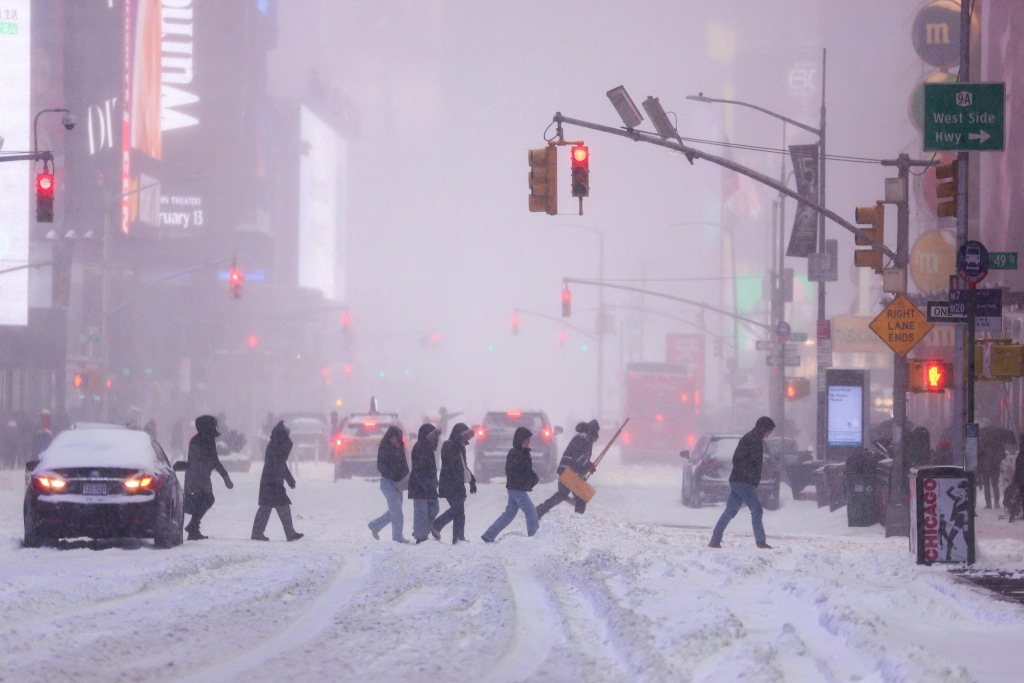 1月25日,美国纽约,人们在时报广场被雪覆盖的街道上行走。
